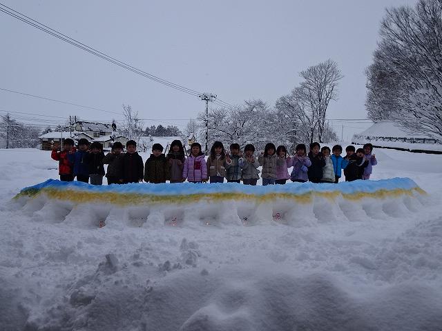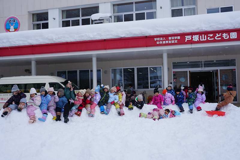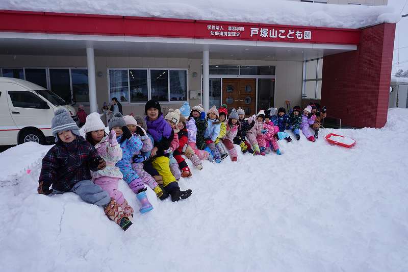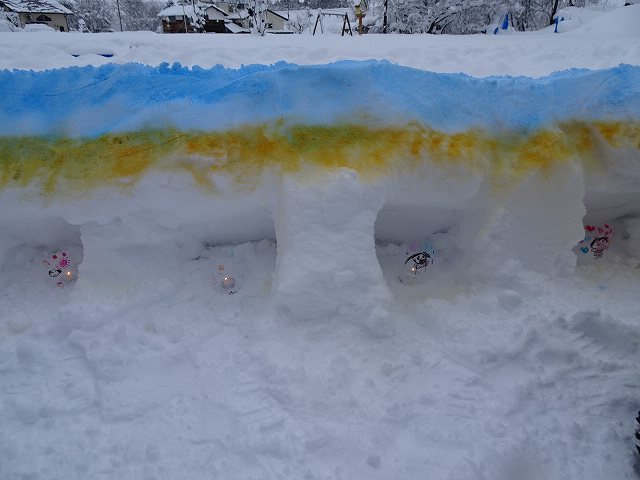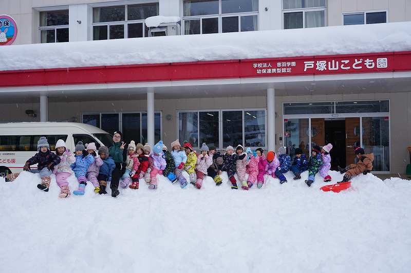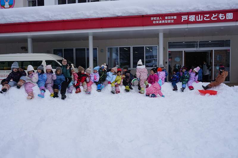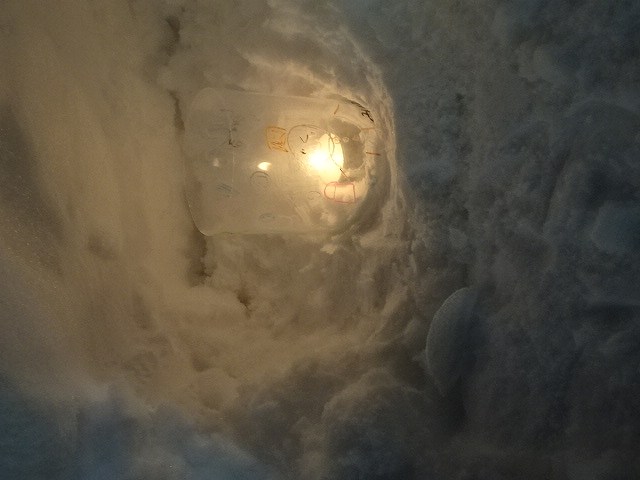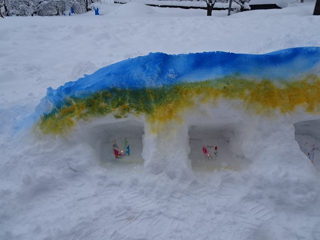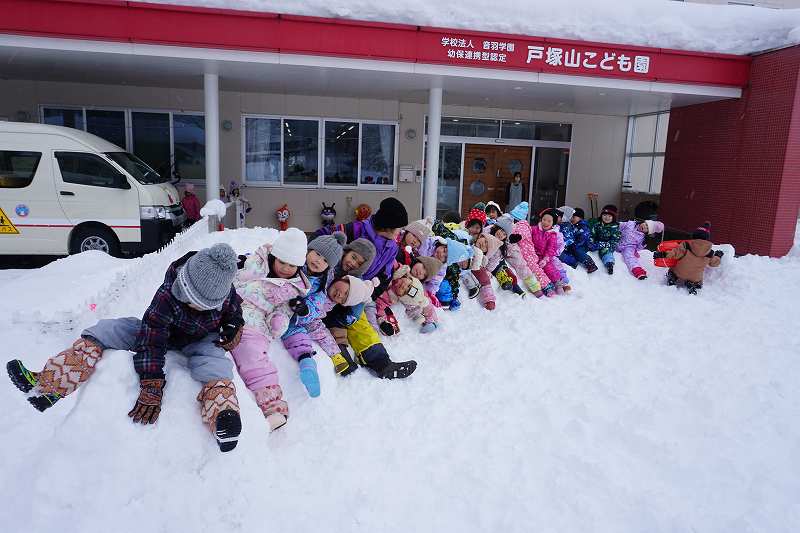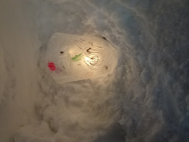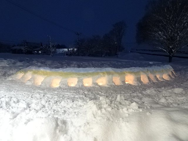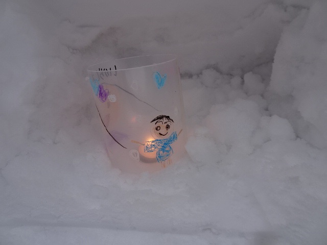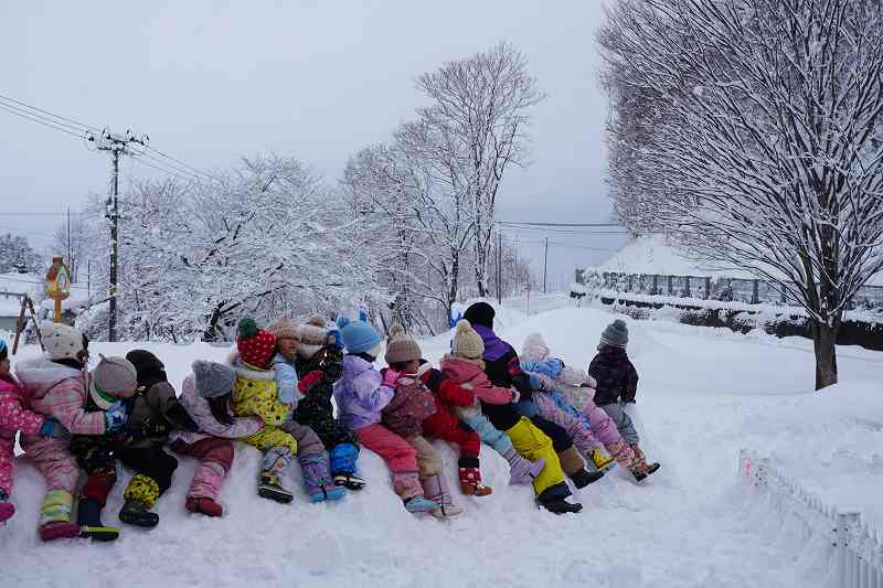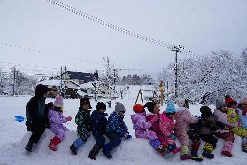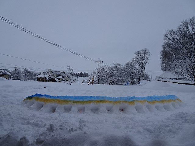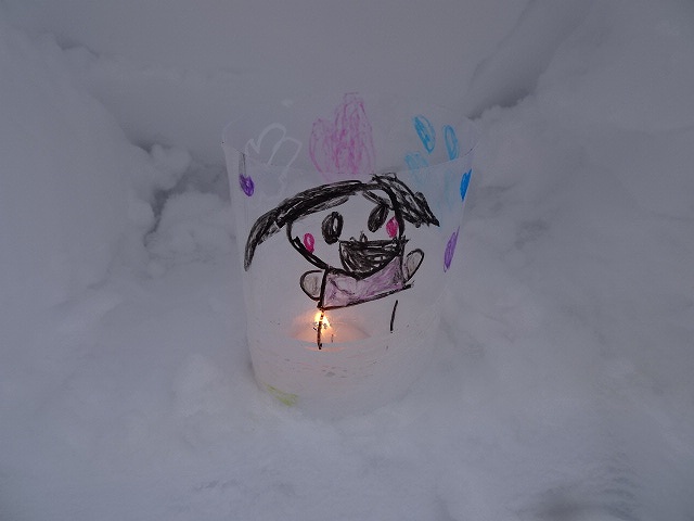 みんなが好きな新幹線と今年の干支「へび」を組み合わせ、すみれ組さんが雪で『へび新幹線』が作りました!みんなで乗ってみたり穴を掘って窓を作ったりと楽しみ、色も染めました。次の日が“雪灯籠まつり”ということで7日(金)の夕方には点灯式をしました。雪の降るなかきれいにろうそくの火が揺れる様子は幻想的で素敵でした。