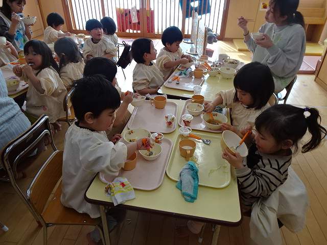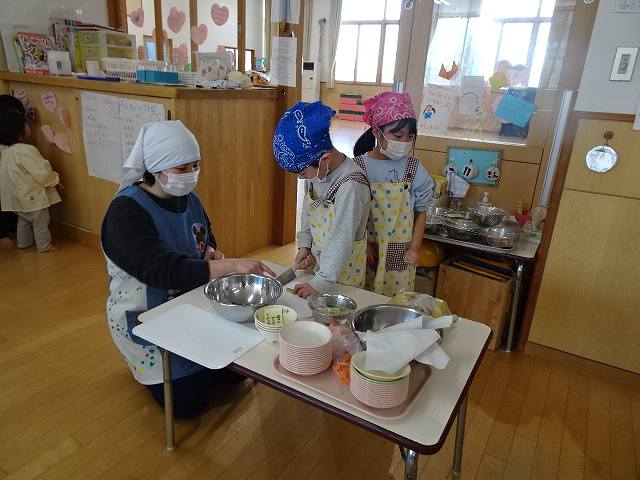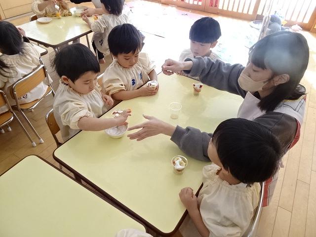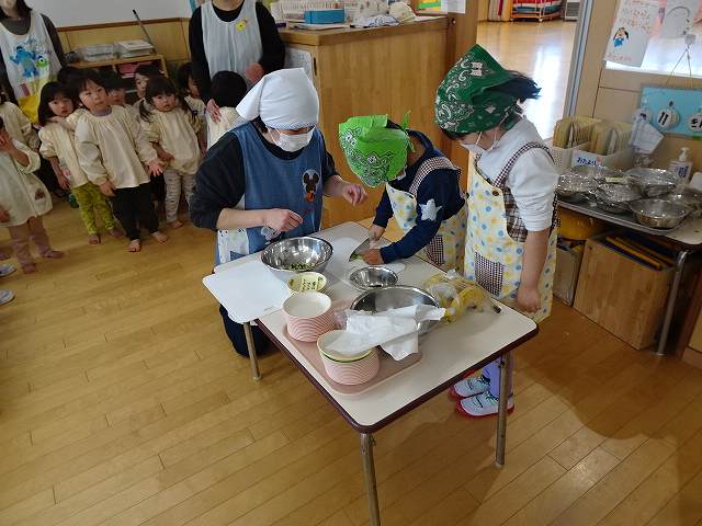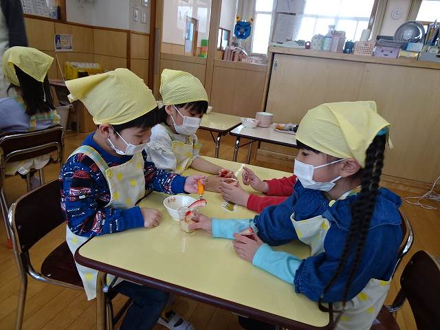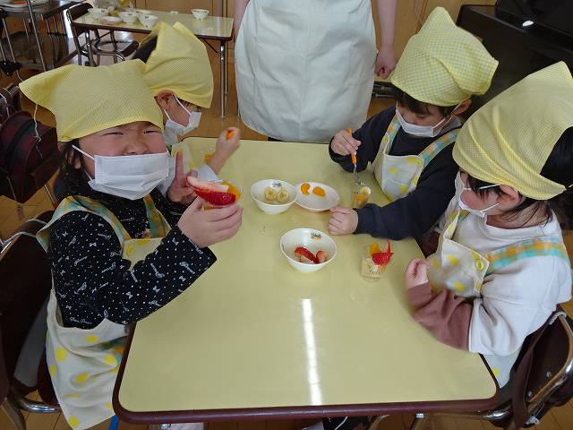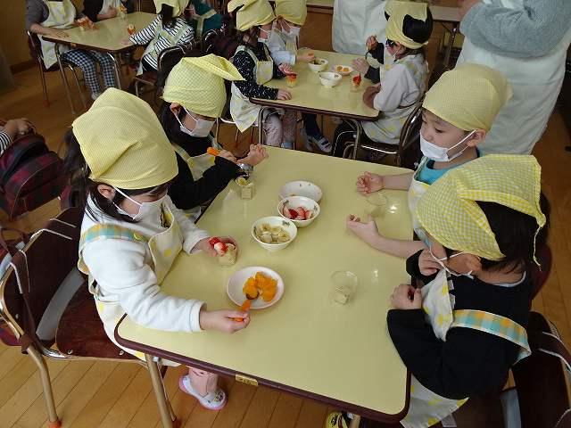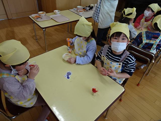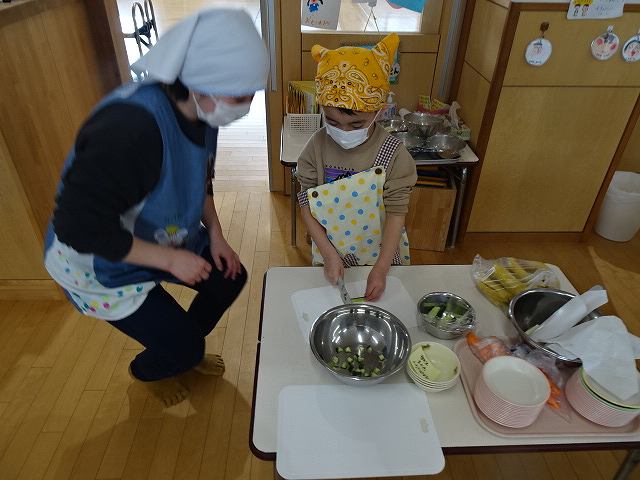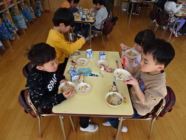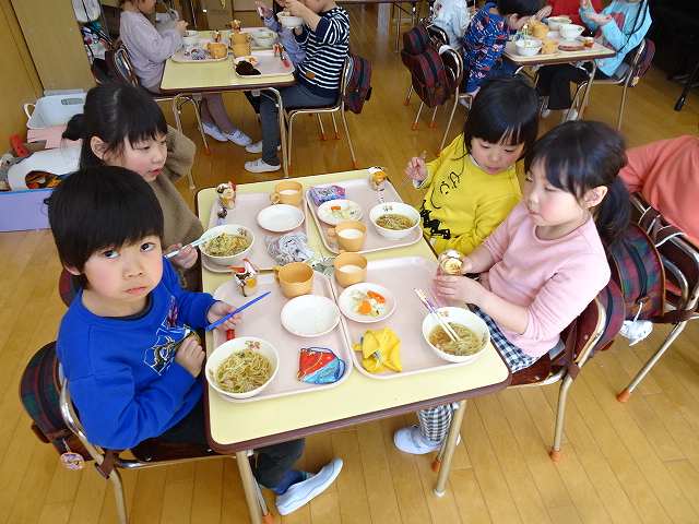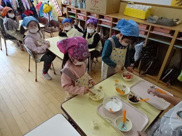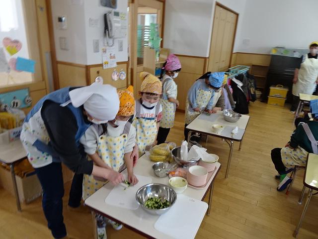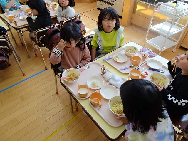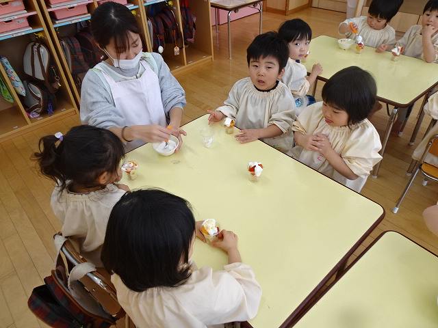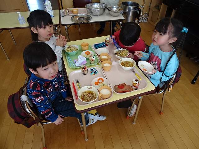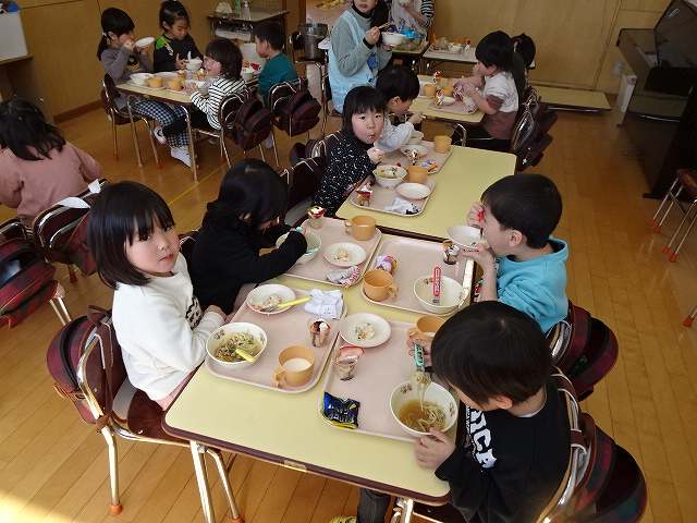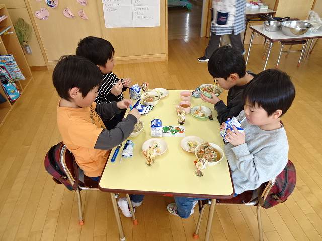 2月20日(木)ランチパーティがありました。メニューはふじ組さんリクエストのでしょうゆラーメン・ポテトサラダ・パフェ。ポテトサラダの野菜を切ったり、ジャガイモを潰したり、ふじ組さんはラーメンの湯切りにも挑戦!パフェの盛り付けも楽しかったね!みんなで作ると、美味しさも倍増!おかわりもたくさんしてお腹いっぱいの子ども達でした。