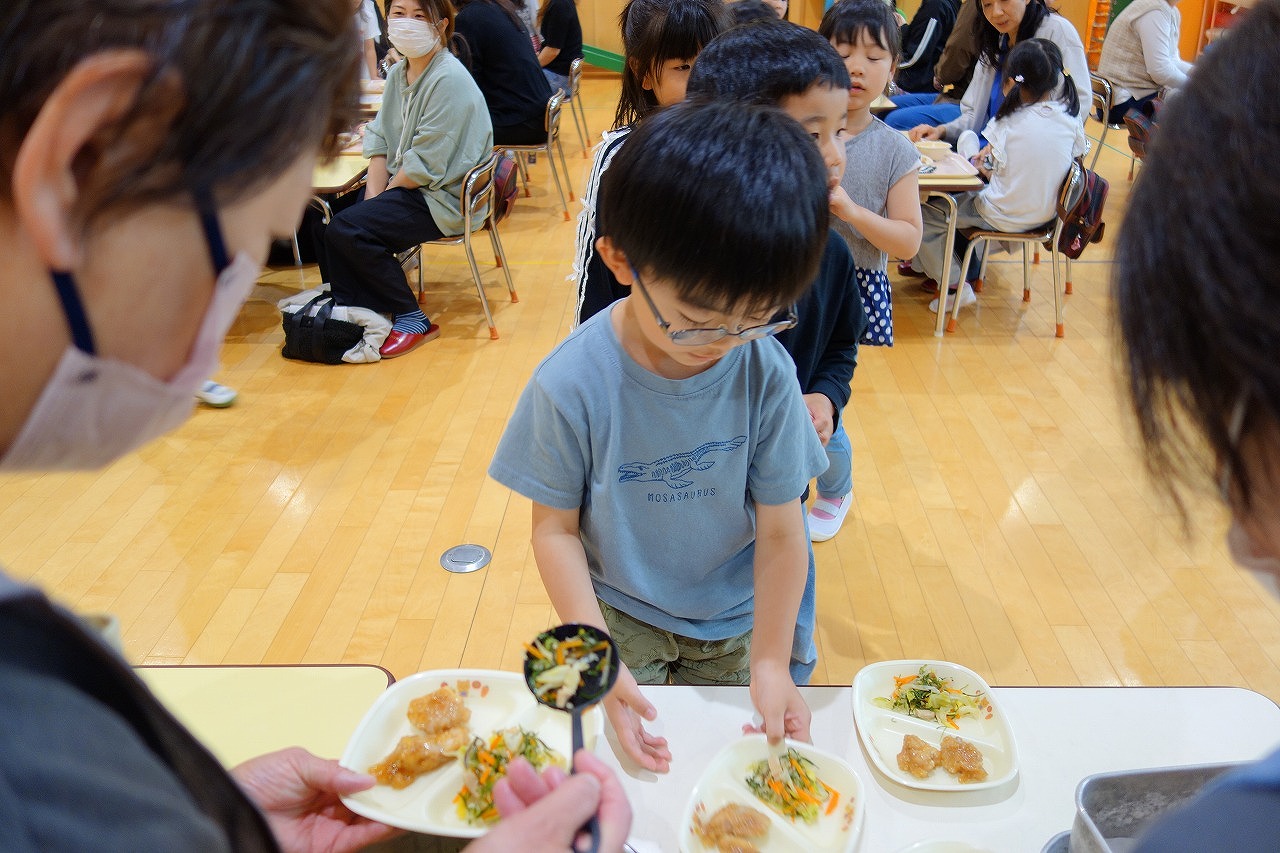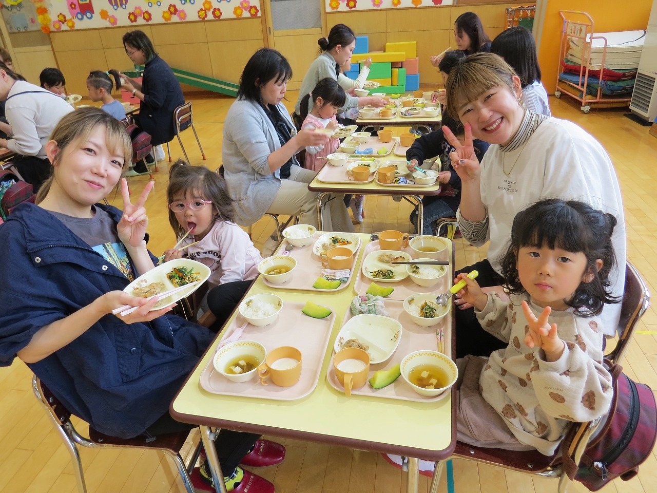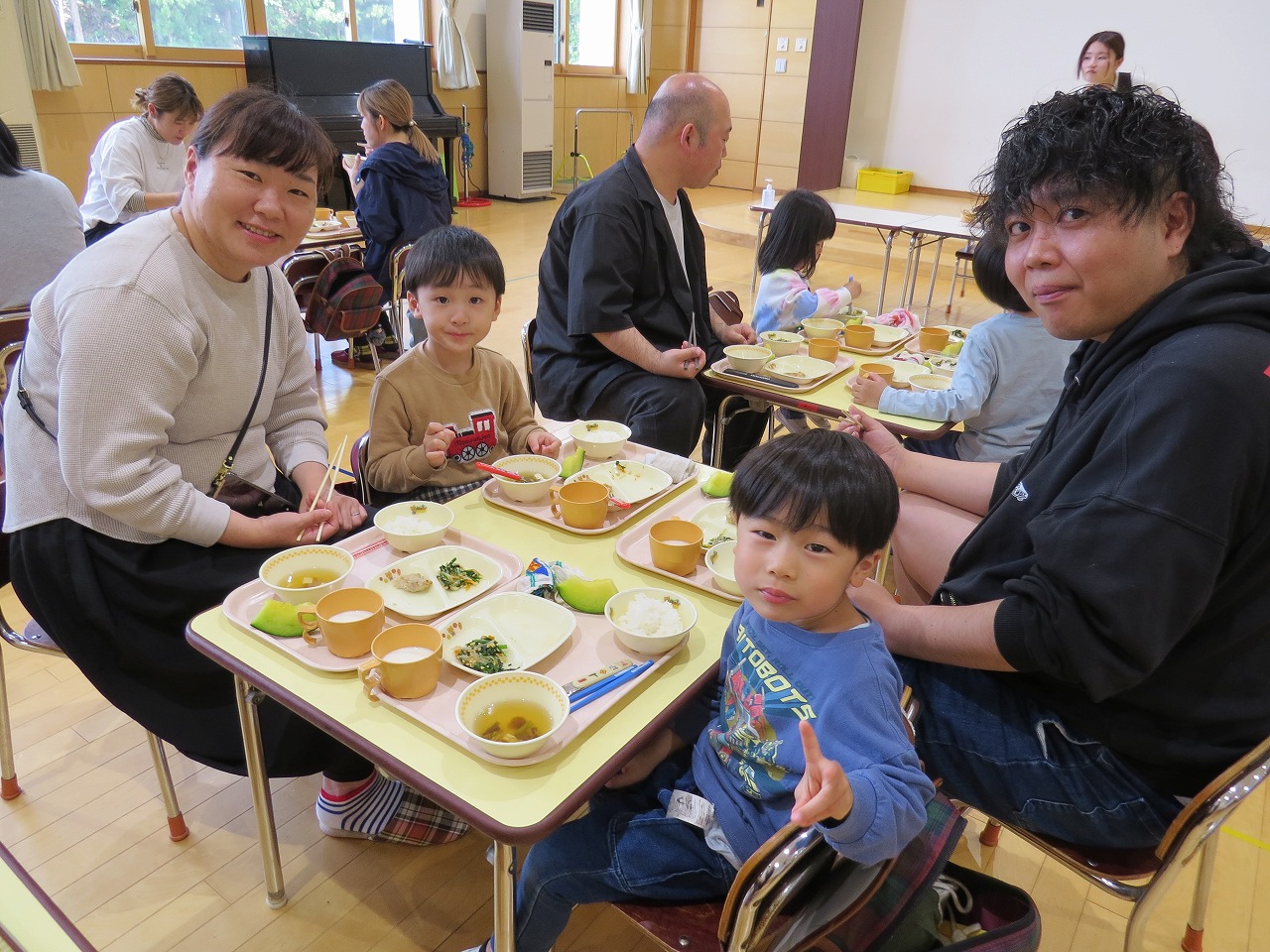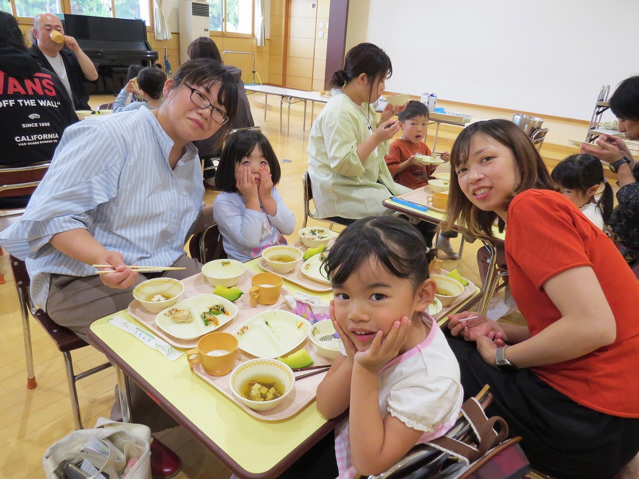 5月20日(火)にふじ組、27日(火)にすみれ組、6月3日(火)にさくら組と、給食試食会を行いました。お家の方と一緒に給食を食べられることをとても楽しみにして待っていた子どもたちは、お母さんやお父さん、おばあちゃんと顔を合わせると、ニコッと笑顔になりとても嬉しそうでした。給食の先生の話に耳を傾け、質問に答えながら食事の大切さを知ったり、お家の方にも園での給食の様子を知って頂くことができたのではないかと思います。お家の方と一緒に食べる給食は格別で、いつも以上に美味しく食べられたようでした。後日頂いたアンケートでもたくさんの良いご意見・ご感想を頂きありがとうございました。励みにしながら、これからの食育活動にも力を入れていきたいと思います。