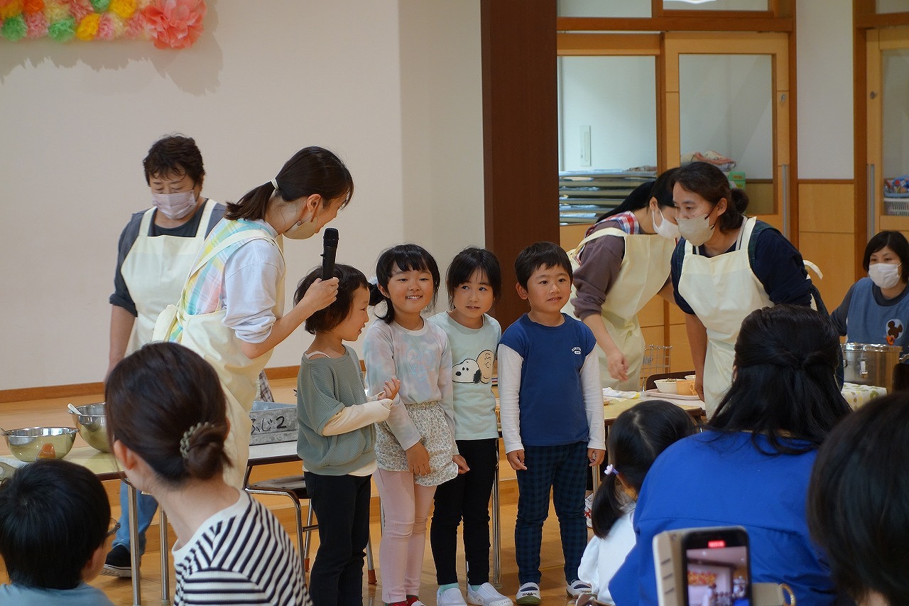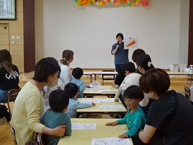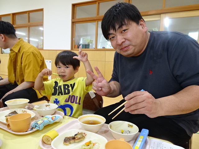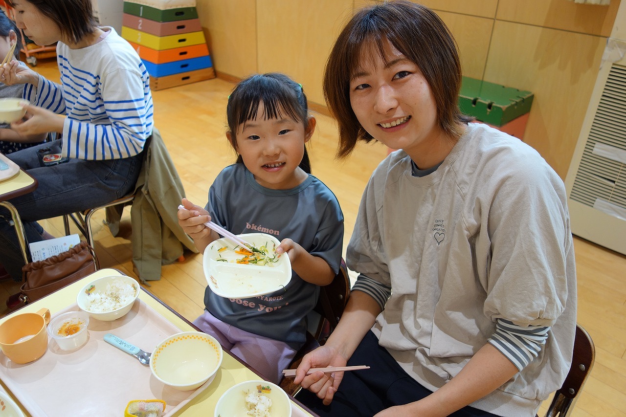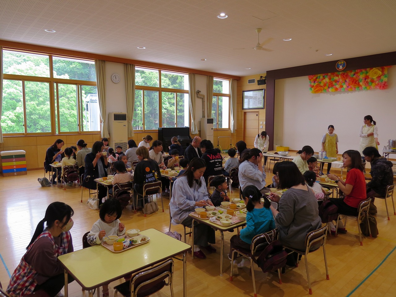 5月20日(火)にふじ組、27日(火)にすみれ組、6月3日(火)にさくら組と、給食試食会を行いました。お家の方と一緒に給食を食べられることをとても楽しみにして待っていた子どもたちは、お母さんやお父さん、おばあちゃんと顔を合わせると、ニコッと笑顔になりとても嬉しそうでした。給食の先生の話に耳を傾け、質問に答えながら食事の大切さを知ったり、お家の方にも園での給食の様子を知って頂くことができたのではないかと思います。お家の方と一緒に食べる給食は格別で、いつも以上に美味しく食べられたようでした。後日頂いたアンケートでもたくさんの良いご意見・ご感想を頂きありがとうございました。励みにしながら、これからの食育活動にも力を入れていきたいと思います。