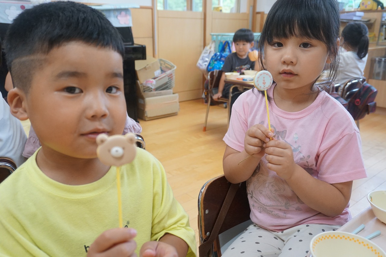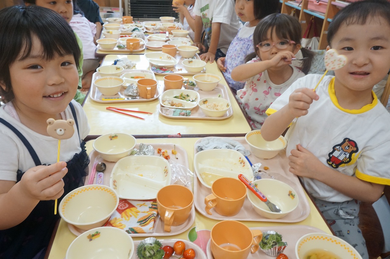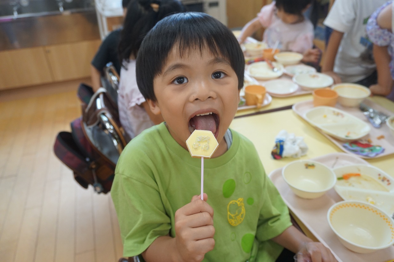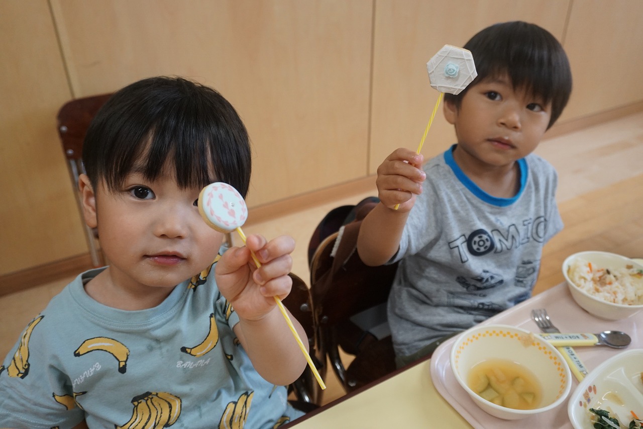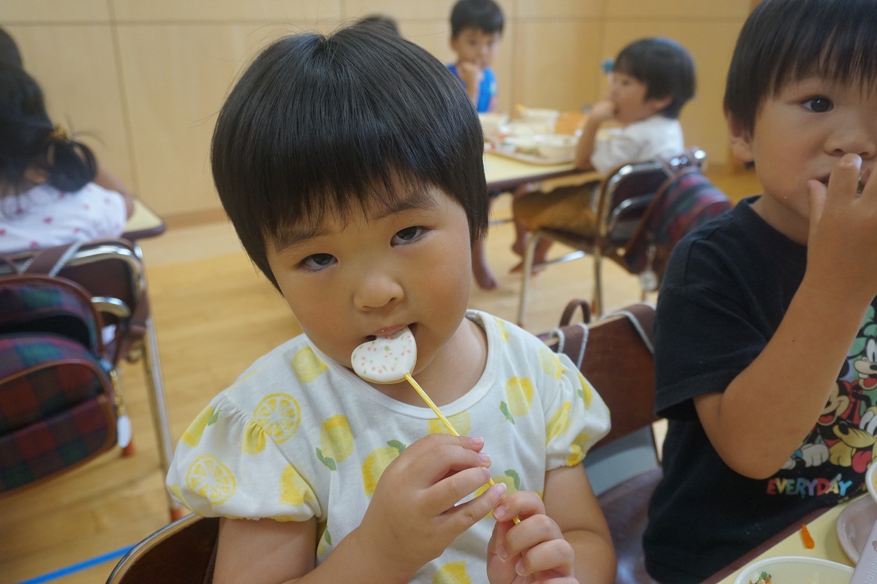 今日は、6月生まれのお誕生会がありました。お誕生会の日の給食はいつもよりも特別!子どもたちも楽しみにしています。今日のデザートにはカエル蒸しパンが登場です。一つひとつ表情の違った可愛らしいカエルちゃんに子どもたちも大喜びでした。そして、中川恵美子さんよりアイシングクッキーを頂き、こちらも一緒に提供させて頂きました。とても可愛いクッキーに目を輝かせて美味しそうに食べていた子どもたちでした。