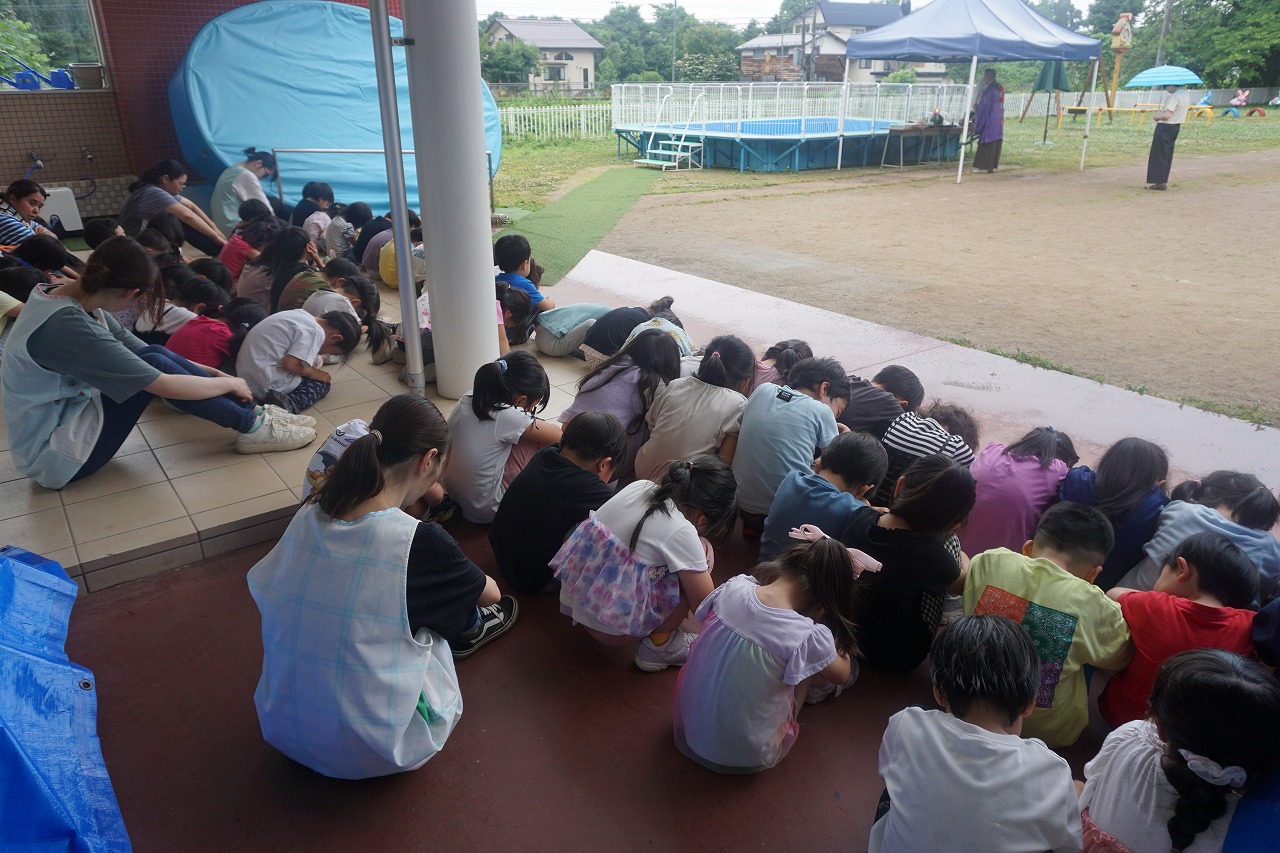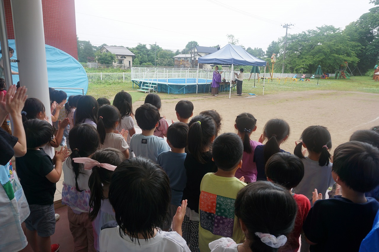 いよいよプール遊びが始まります。昨日は、ふじ組代表の子どもたちがプール掃除をしてくれました。一生懸命丁寧に洗ってくれたおかげでとてもきれいになり、気持ち良くプール遊びがスタートできそうです。そして、今日は大覚院さんにご祈祷をして頂きました。雨の降る中ではありましたが、怪我なく安全に遊べるように子どもたちと一緒に祈願したところです。天気と相談しながら、たくさん水あそびを楽しみたいと思います。