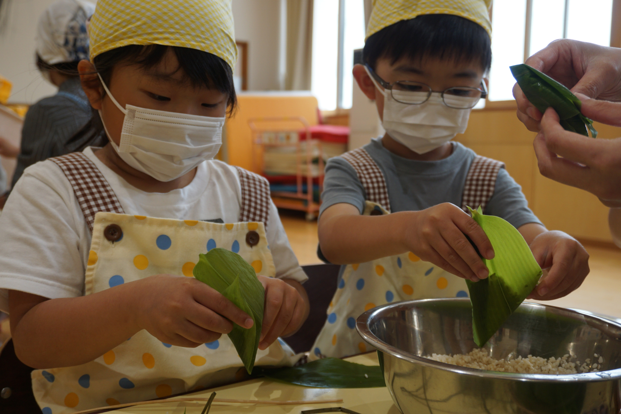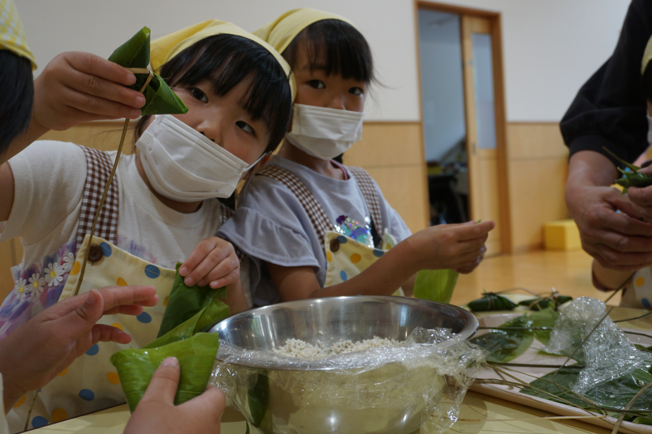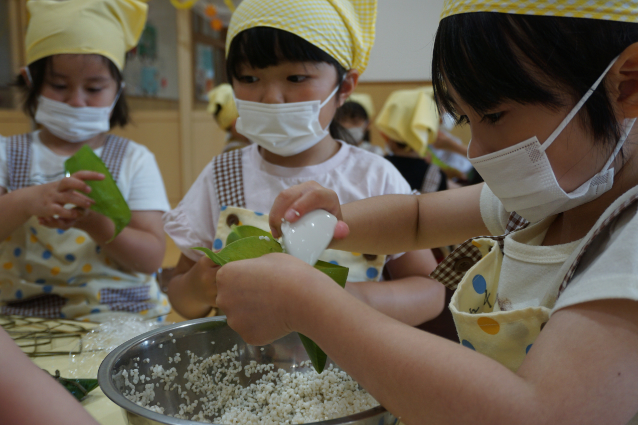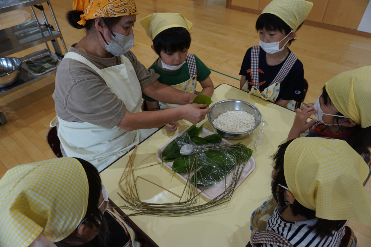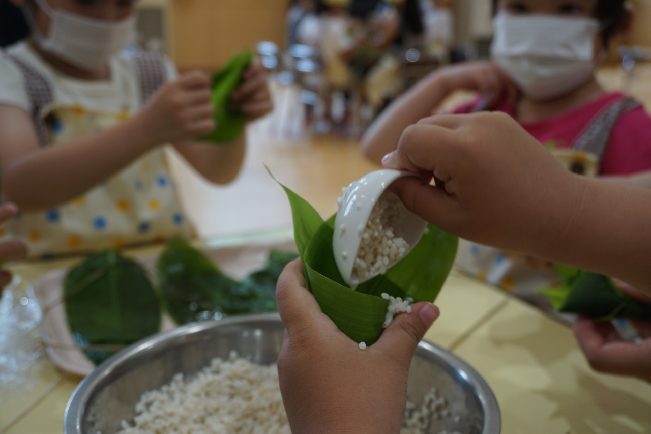 山形県の郷土料理の一つでもある笹巻を年長さんで作りました。戸塚山の自然の中には、笹がたくさんとれるスポットがあり、笹の採取から開始!最初に採りに行ったときにはまだ若々しい葉がいっぱいでしたが、2回目に採りに行くと、笹もぐんぐん生長していて、立派な笹の葉を沢山収穫してくることができました。笹巻を作る工程はなかなか難しいので、お家の方にもお声がけをしたところ、2名のおばあちゃんにお手伝い頂けることになりました。笹をくるっと巻いて三角にしたところにもち米を入れ、笹を被せて蓋をし、い草で取れないように巻く…といった作り方ですが、大人でも慣れないと難しい中、子どもたちはお米をこぼさないように気を付けながら、真剣な眼差しで取り組んでいました。大小様々ですが、力を合わせてなんと150個以上完成しました。給食室で茹でてもらい一晩寝かせた後、翌日の給食の時間に美味しくいただきました。他のクラスにもお裾分けをし、沢山の「おいしい!」の声が聞こえてきました。