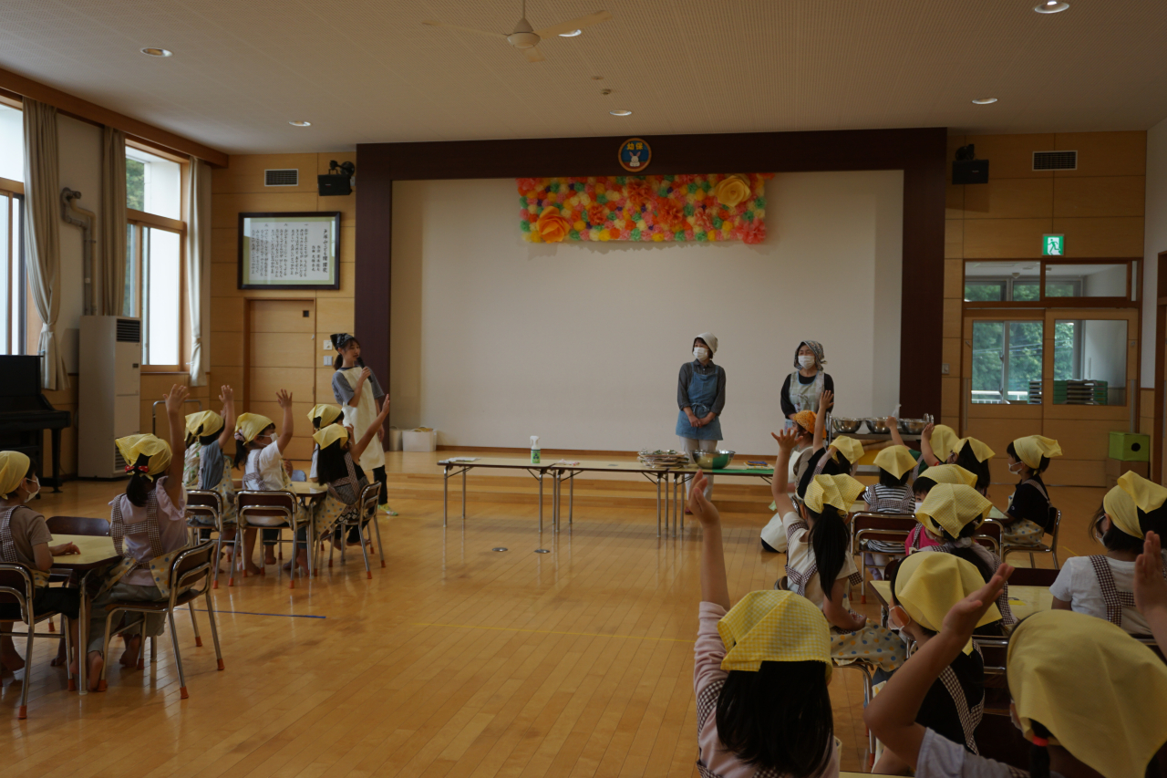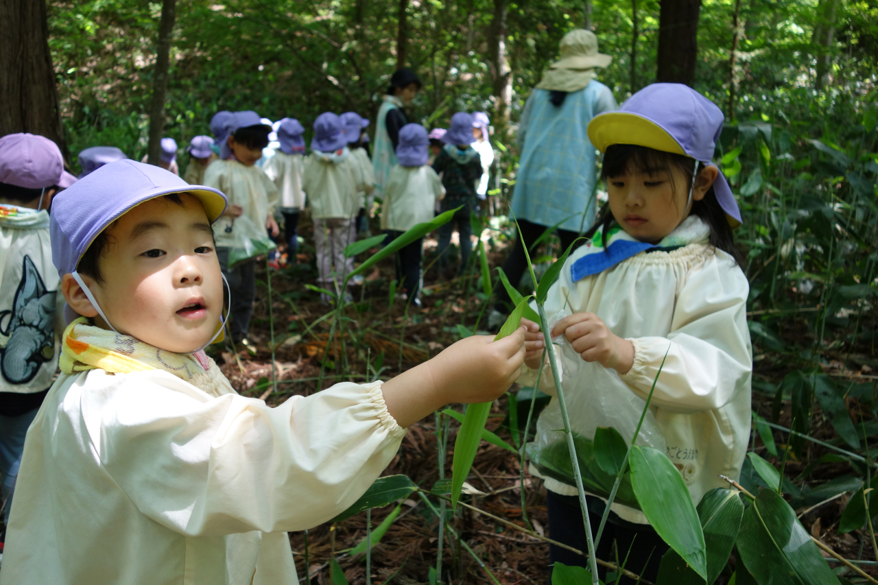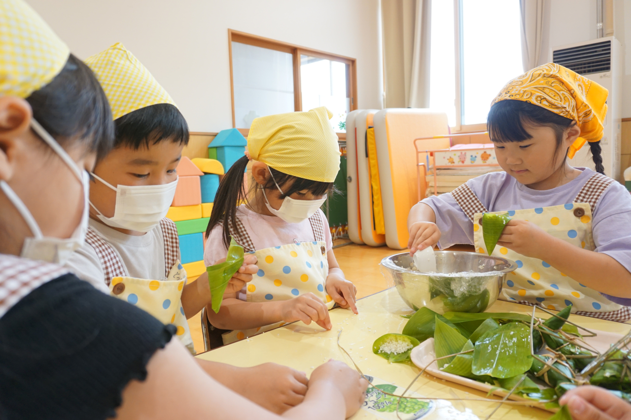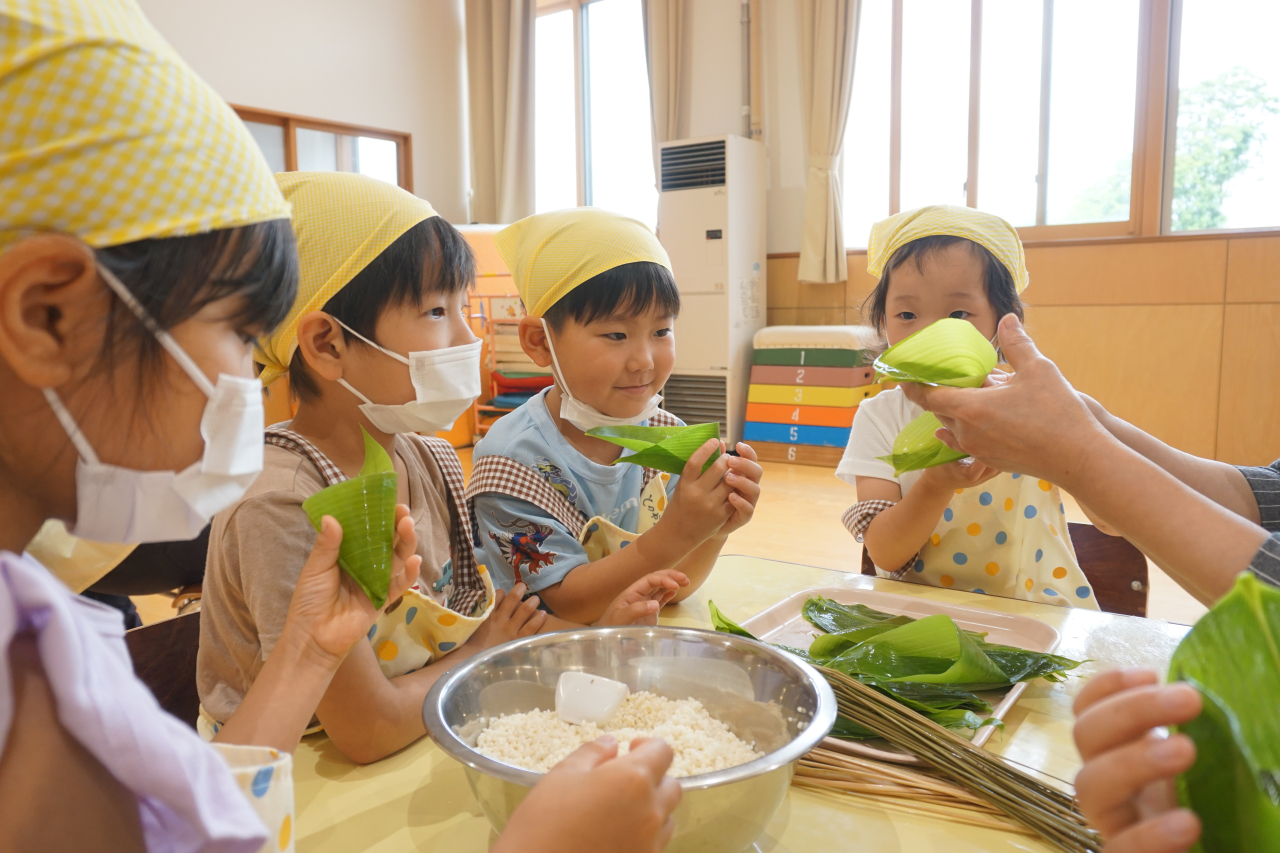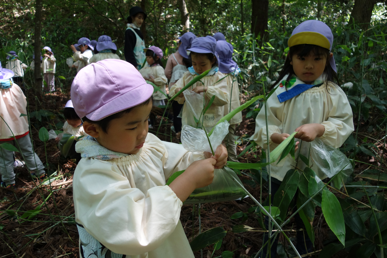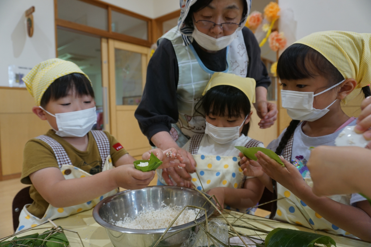 山形県の郷土料理の一つでもある笹巻を年長さんで作りました。戸塚山の自然の中には、笹がたくさんとれるスポットがあり、笹の採取から開始!最初に採りに行ったときにはまだ若々しい葉がいっぱいでしたが、2回目に採りに行くと、笹もぐんぐん生長していて、立派な笹の葉を沢山収穫してくることができました。笹巻を作る工程はなかなか難しいので、お家の方にもお声がけをしたところ、2名のおばあちゃんにお手伝い頂けることになりました。笹をくるっと巻いて三角にしたところにもち米を入れ、笹を被せて蓋をし、い草で取れないように巻く…といった作り方ですが、大人でも慣れないと難しい中、子どもたちはお米をこぼさないように気を付けながら、真剣な眼差しで取り組んでいました。大小様々ですが、力を合わせてなんと150個以上完成しました。給食室で茹でてもらい一晩寝かせた後、翌日の給食の時間に美味しくいただきました。他のクラスにもお裾分けをし、沢山の「おいしい!」の声が聞こえてきました。