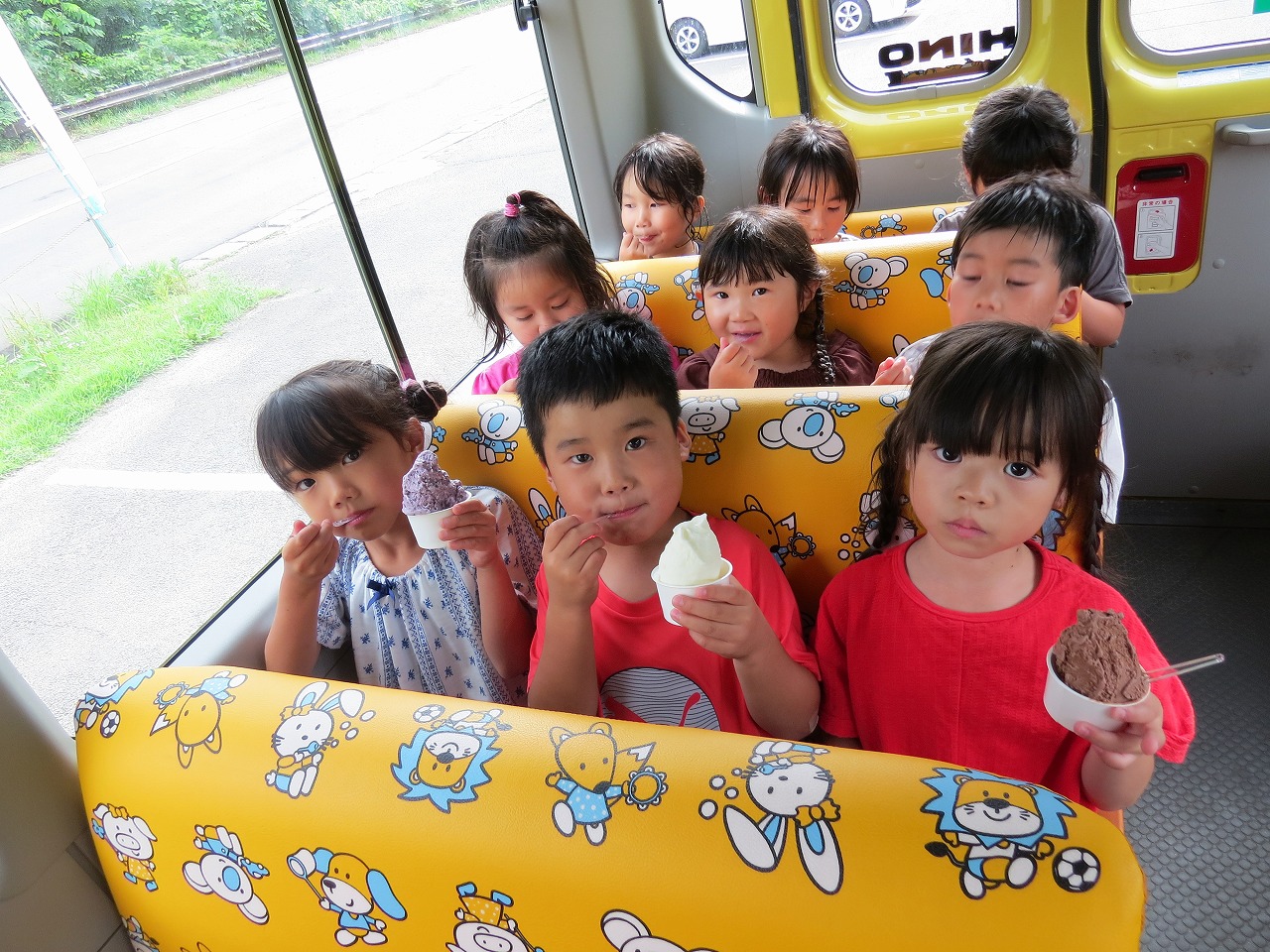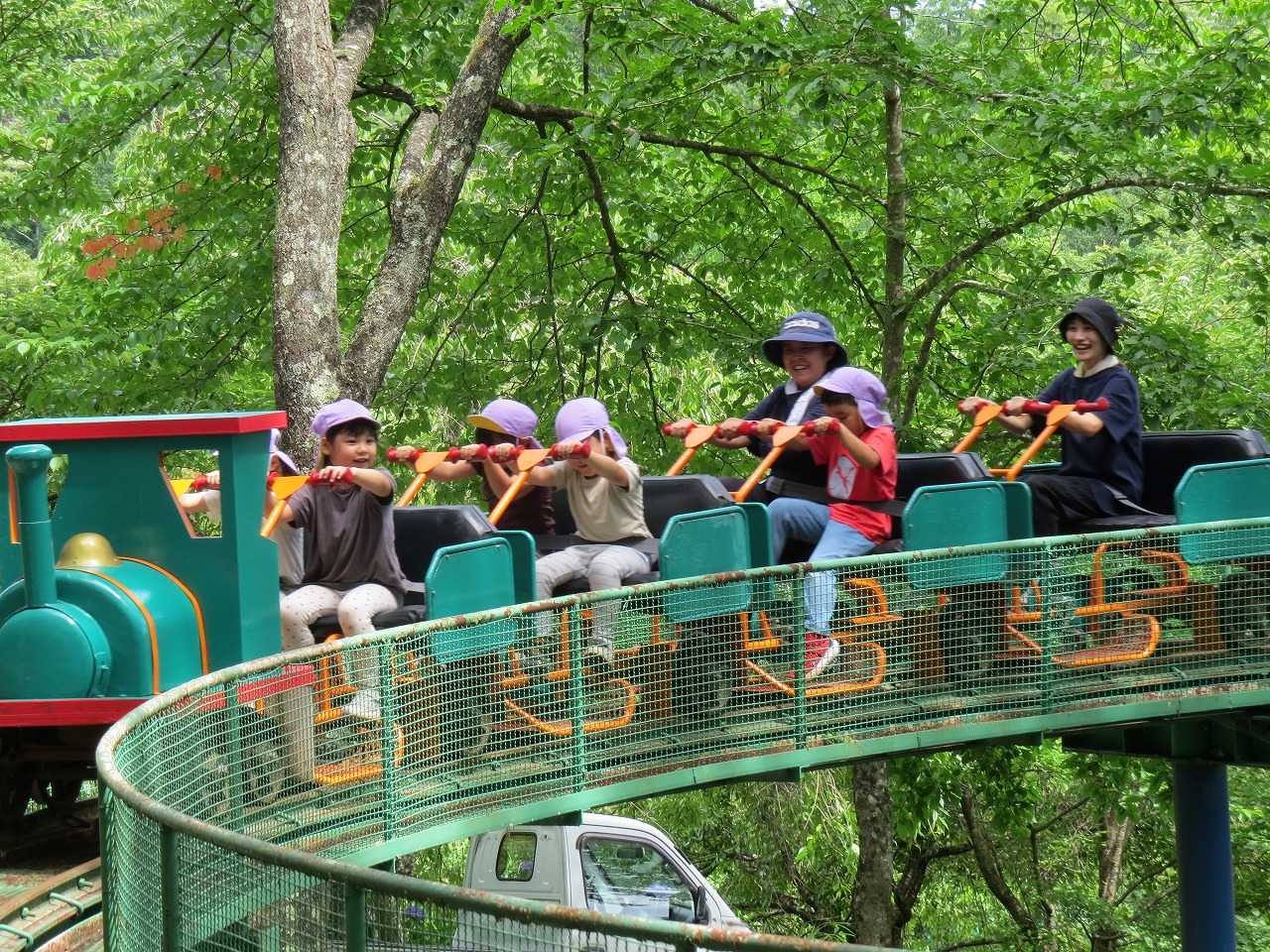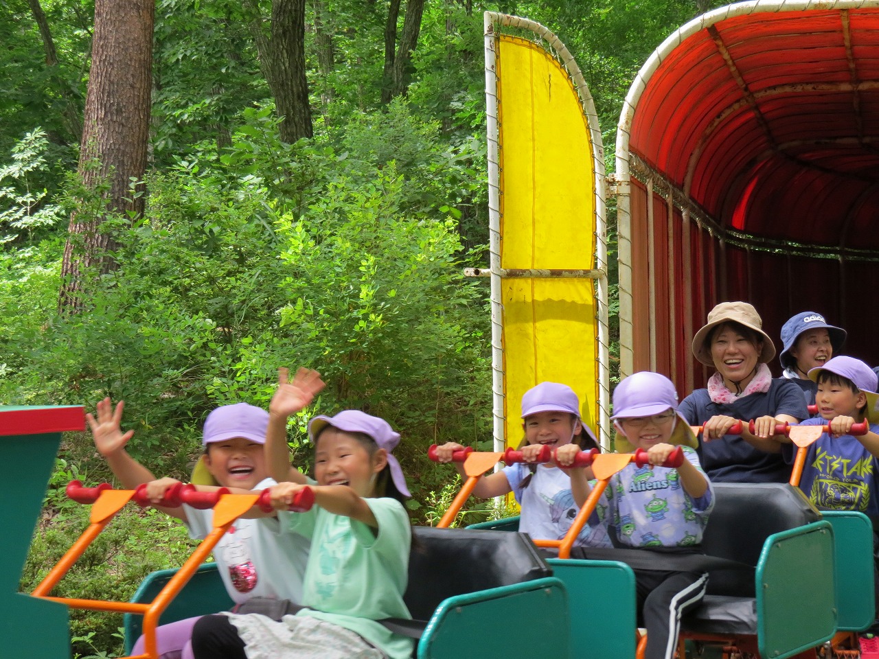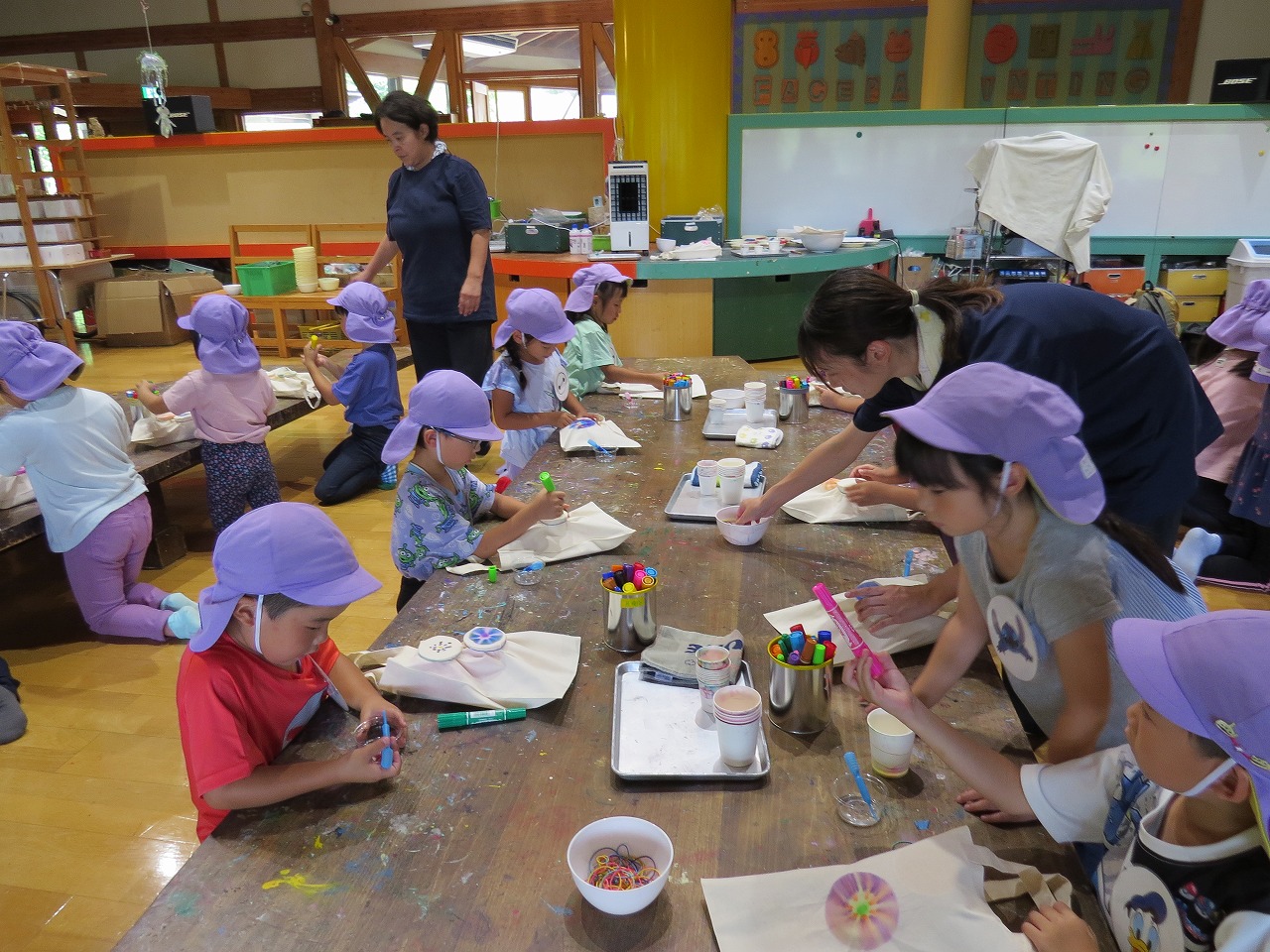 7月18日(金)~19日(土)にかけて、年長さんのお泊り保育を行いました。誰一人体調を崩すことなく元気に当日を迎え、ドキドキ・ワクワクお泊り保育のスタートです。始まりの会をした後は、早速バスに乗って、福島県にある霊山こどもの村へ出発!こどもの村に着くと、まずワークショップでオリジナルトートバッグ作りを楽しみました。ペンとエタノールを使って花火を描き、世界に一つだけの素敵なバッグが完成しました。その後は、大きな広い滑り台を繰り返し滑り楽しみ、お弁当を食べてひと休み。午後はグループごとにサイクル列車に乗り、ペダルをこぎスピードに乗って駆け抜けることに大喜びでした!こどもの村の後は、入浴施設のお風呂に入って汗を流し、ジェラート屋さんで好きなアイスを食べて帰ってきました。