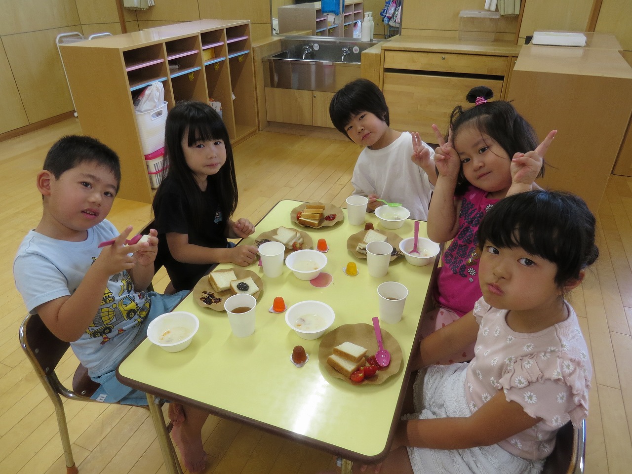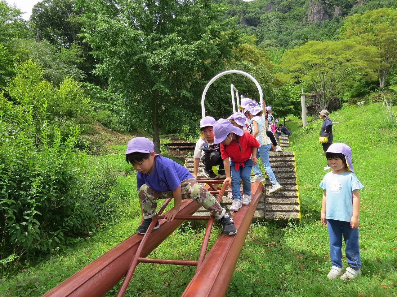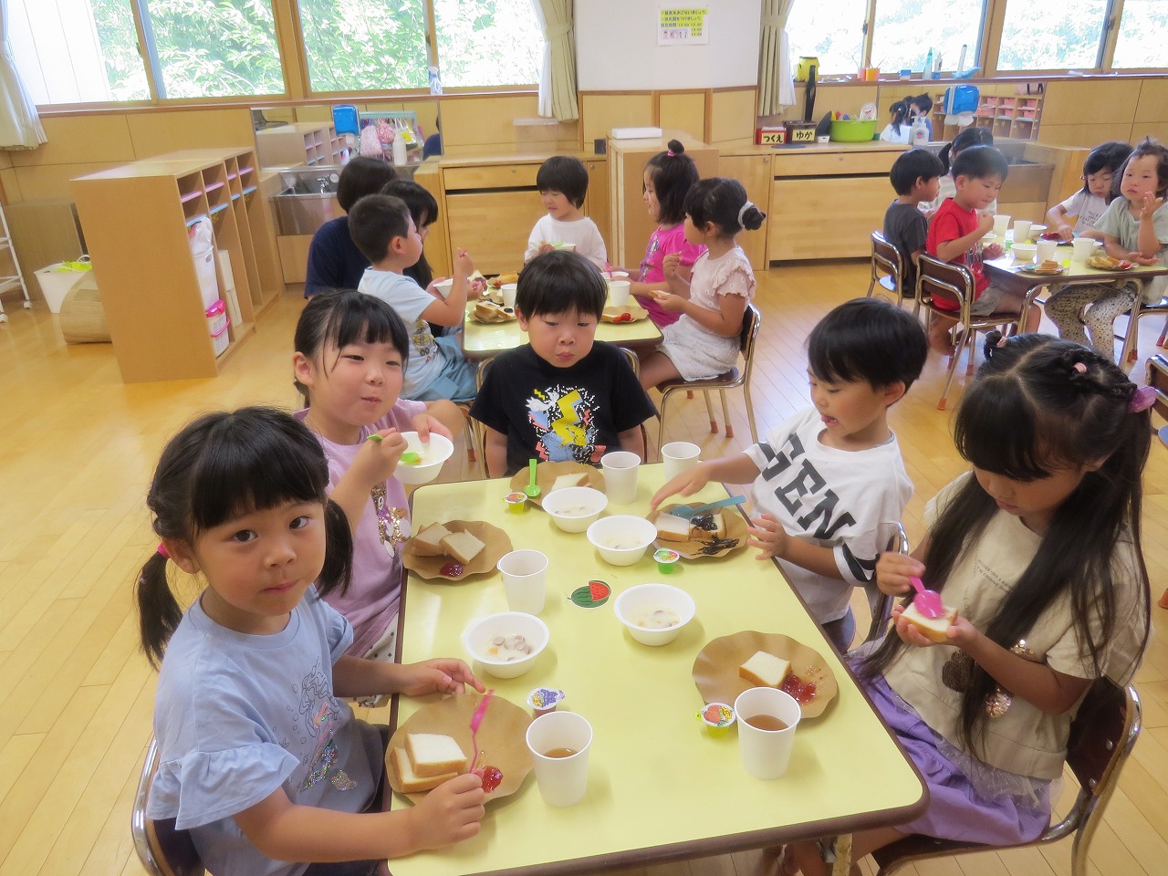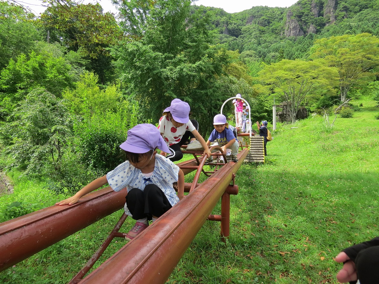 7月18日(金)~19日(土)にかけて、年長さんのお泊り保育を行いました。誰一人体調を崩すことなく元気に当日を迎え、ドキドキ・ワクワクお泊り保育のスタートです。始まりの会をした後は、早速バスに乗って、福島県にある霊山こどもの村へ出発!こどもの村に着くと、まずワークショップでオリジナルトートバッグ作りを楽しみました。ペンとエタノールを使って花火を描き、世界に一つだけの素敵なバッグが完成しました。その後は、大きな広い滑り台を繰り返し滑り楽しみ、お弁当を食べてひと休み。午後はグループごとにサイクル列車に乗り、ペダルをこぎスピードに乗って駆け抜けることに大喜びでした!こどもの村の後は、入浴施設のお風呂に入って汗を流し、ジェラート屋さんで好きなアイスを食べて帰ってきました。