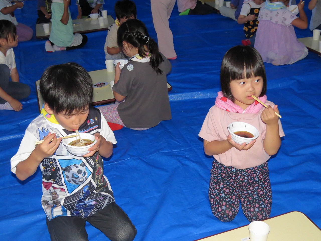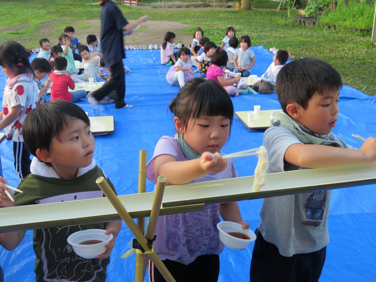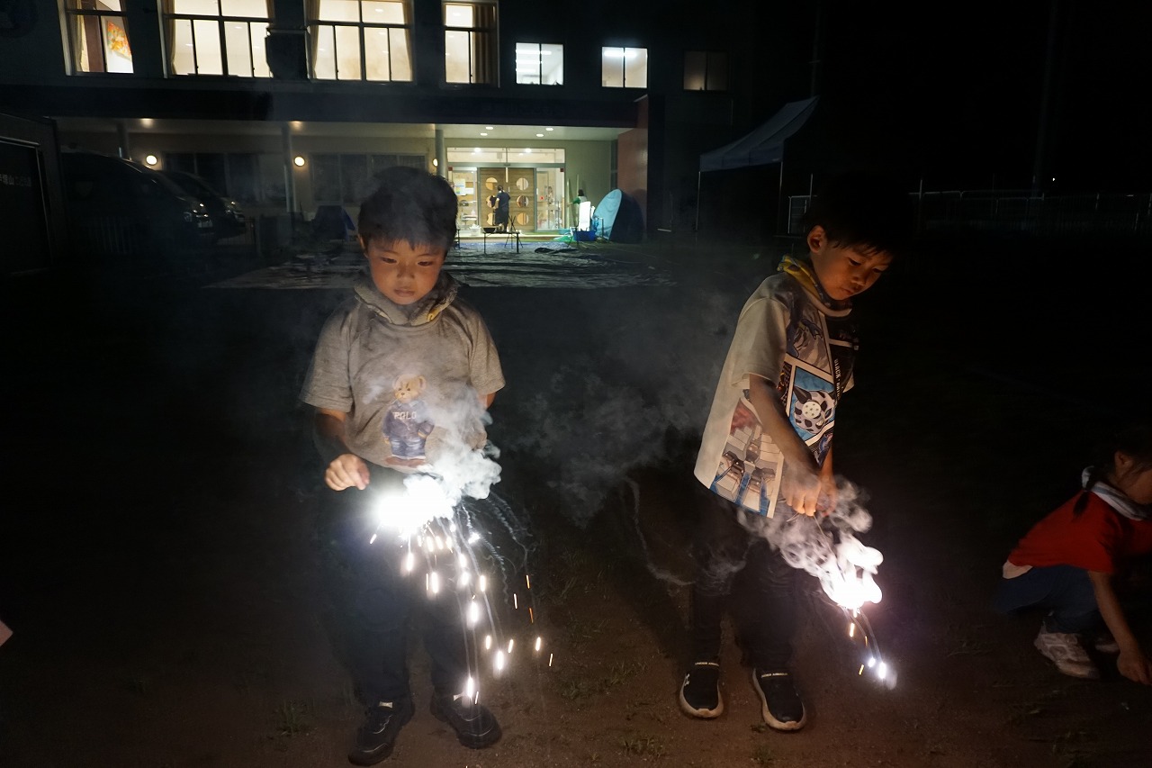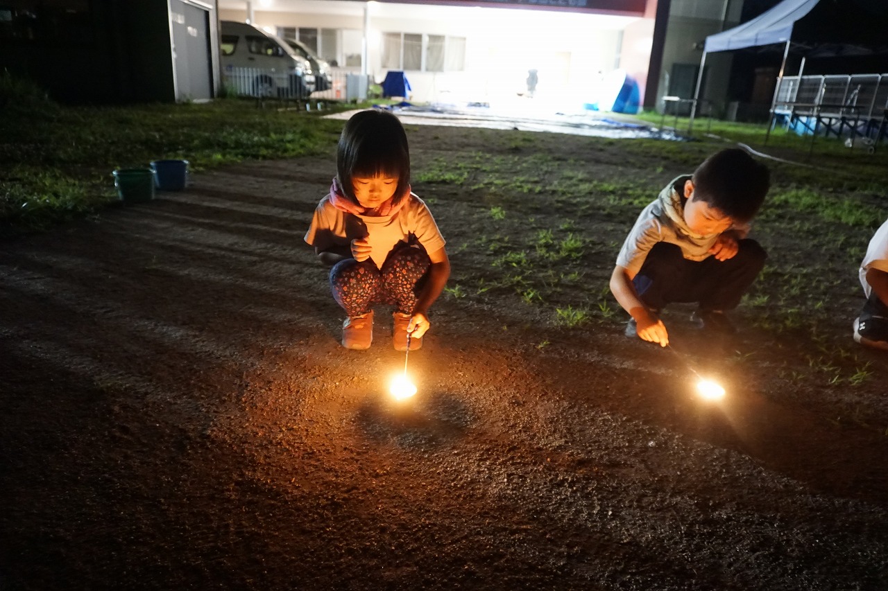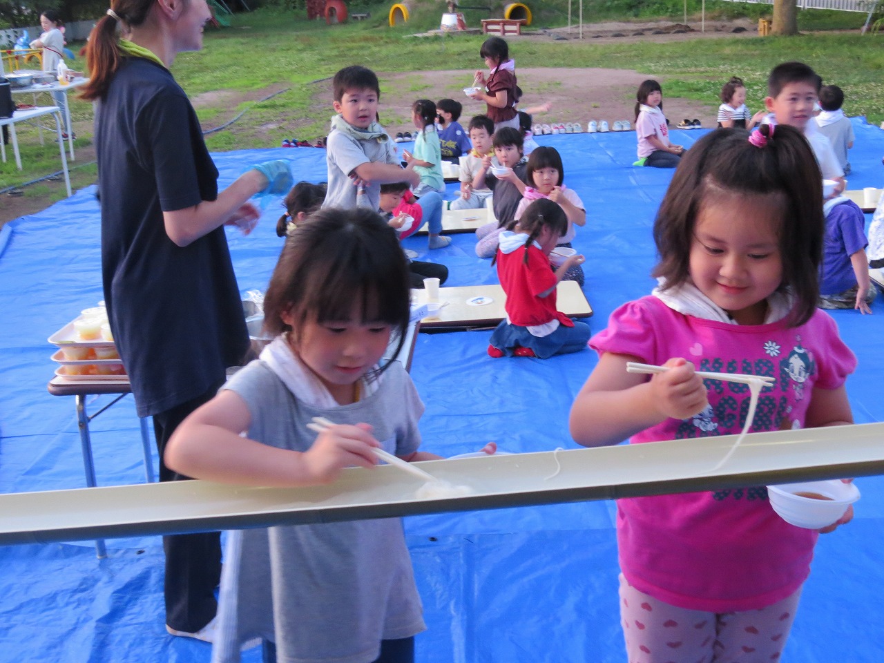 園に戻ってからもお楽しみがたくさん!〇×クイズをしてご褒美のおやつをもらったり、夜ごはんは流しそうめんにバーベキューとお腹いっぱい食べました。夜のカブト虫を探しや花火も楽しみ、たくさん夏を満喫し、おやすみの時間となりました。