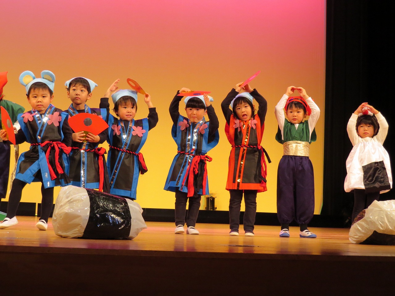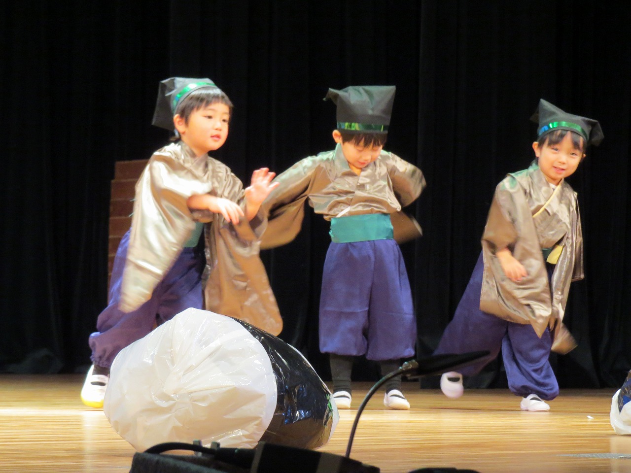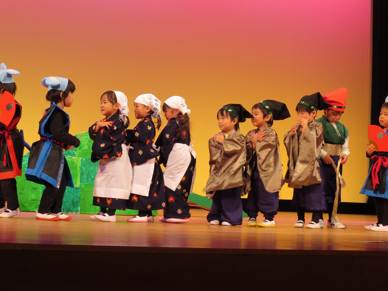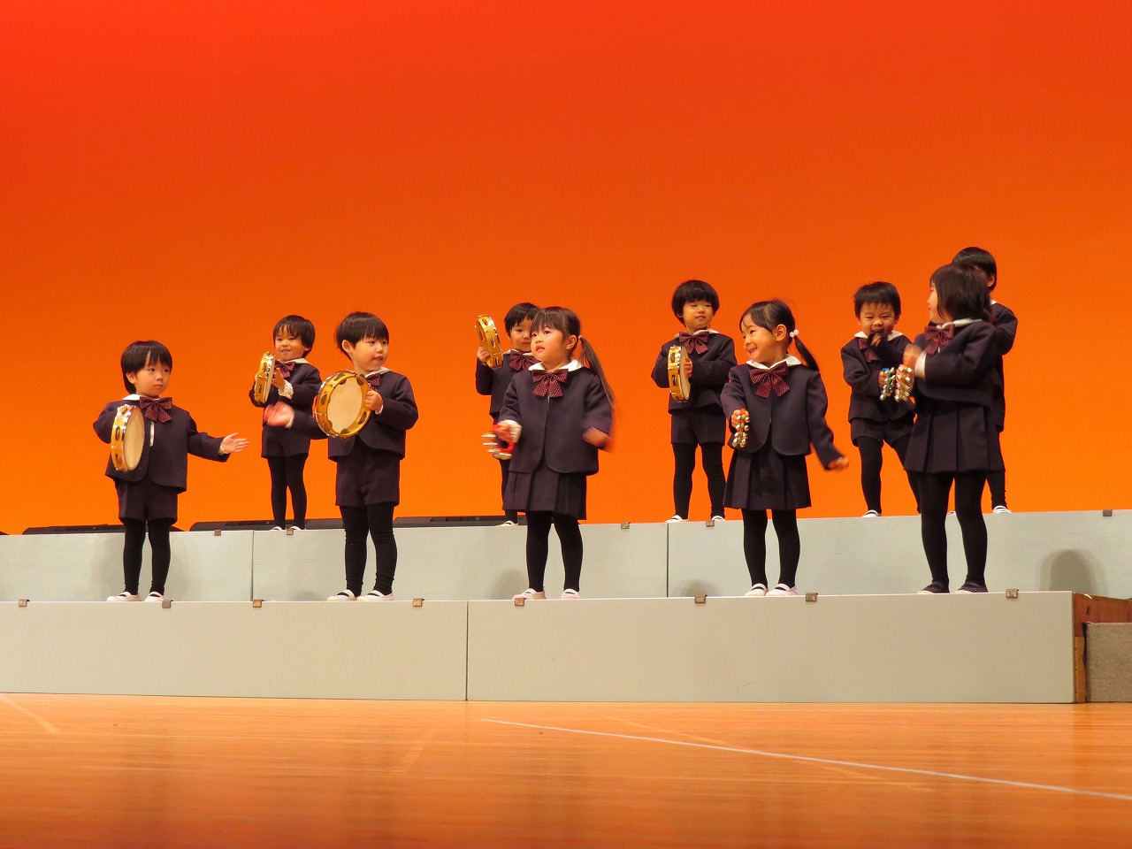 12月18日(木)は発表会を行いました。今年一年こどもたちが頑張ってきたことを保護者の方にも見て頂けるよう、それぞれのクラスが工夫しながら取り組んできました。さくら組さんは合奏や歌、オペレッタ「おむすびころりん」に挑戦!すみれ組さんは鼓隊演奏とミュージカル「シンデレラ」に挑戦しました。そして、ふじ組さんはアンサンブル奏「ディズニーメドレー」と劇「泣いたあかおに」を年長児らしく発表してくれました!本番の舞台裏では、「緊張するー」とドキドキする子どもたちの様子が見られましたが、いざ舞台の上に立つと、みんな一生懸命に笑顔で演じることができました!発表が終わると「楽しかったー!!」という声がたくさん聞こえ、達成感や喜びを感じ、大きな自信へと繋がったようです。「また発表会やりたい!」という子もいた程、一人ひとり輝くことができました。