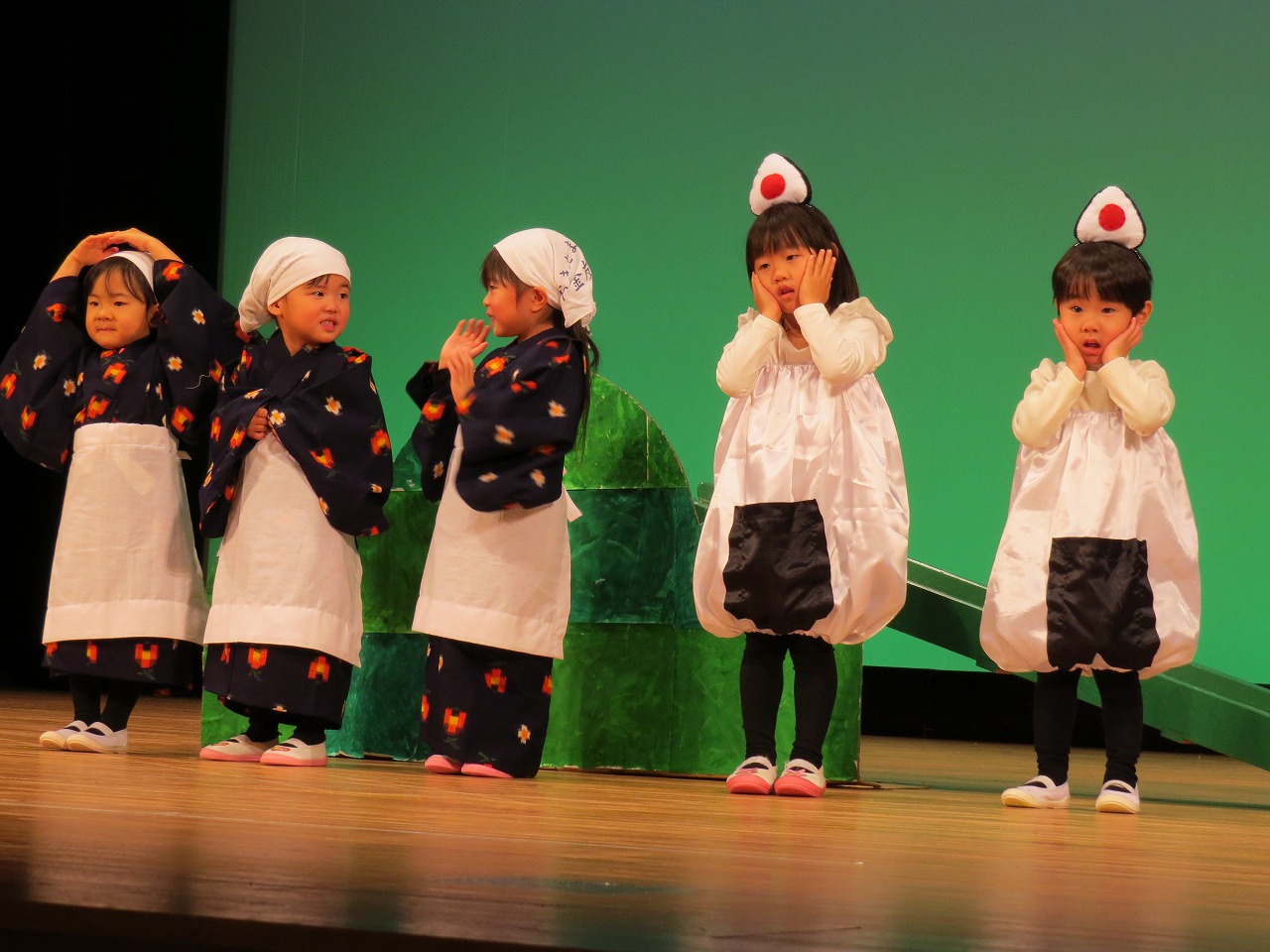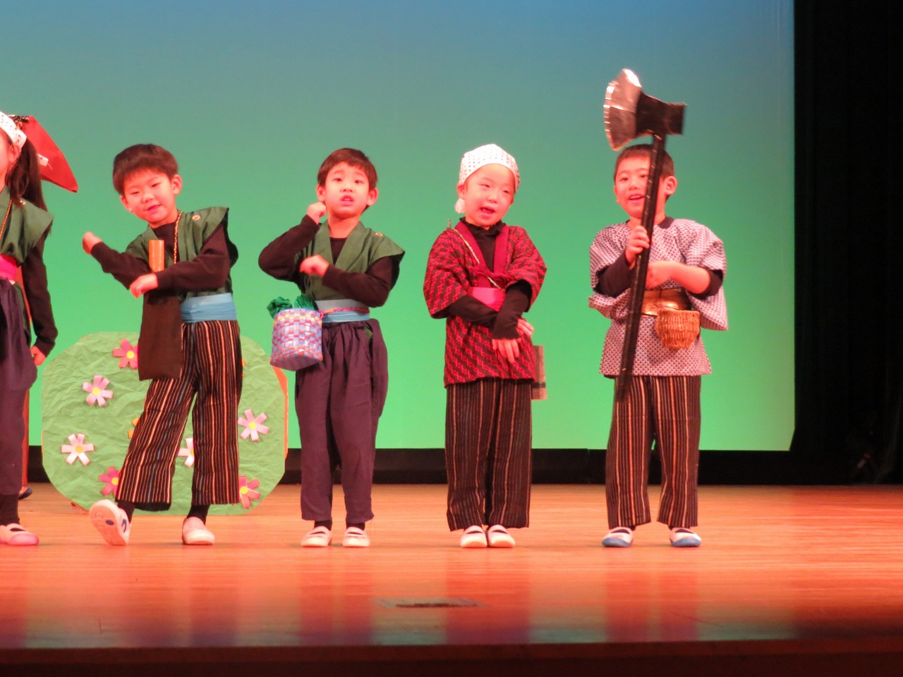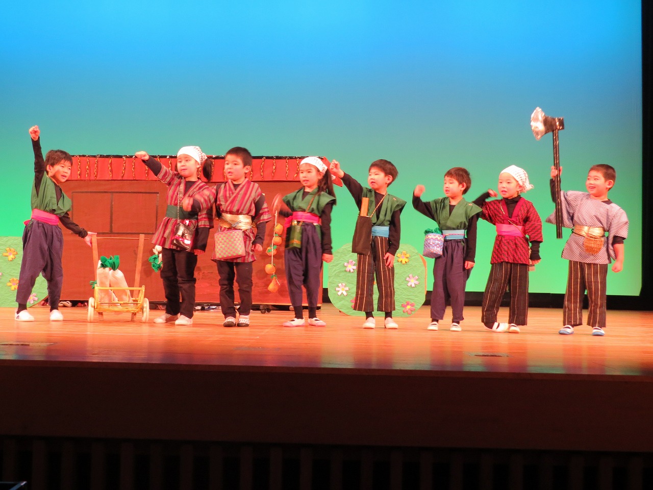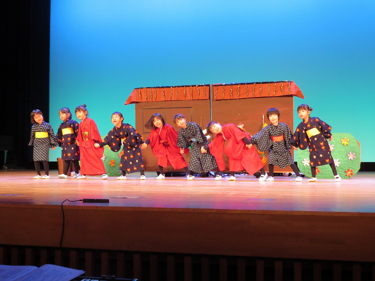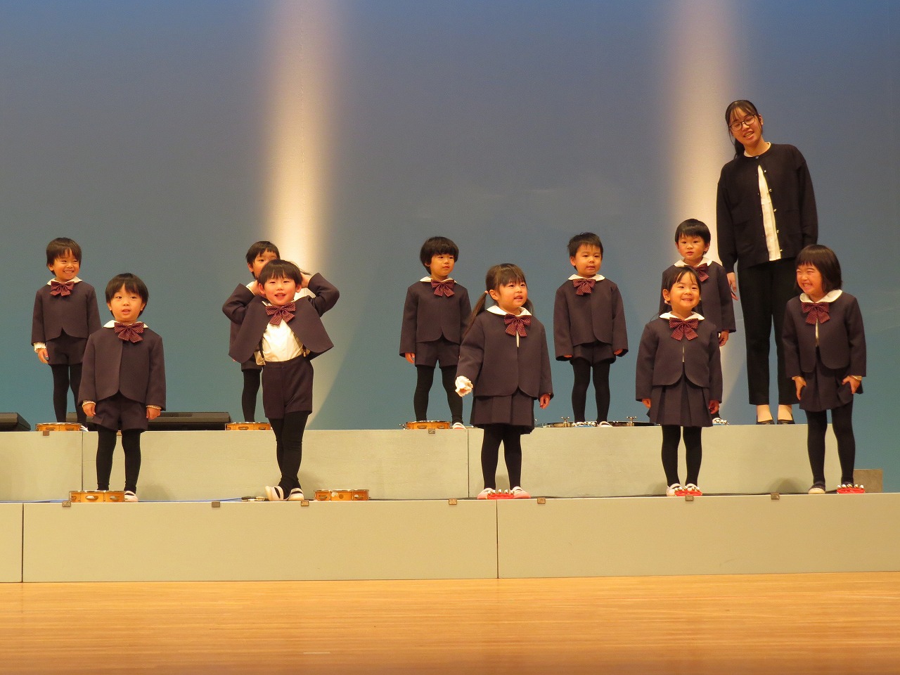 12月18日(木)は発表会を行いました。今年一年こどもたちが頑張ってきたことを保護者の方にも見て頂けるよう、それぞれのクラスが工夫しながら取り組んできました。さくら組さんは合奏や歌、オペレッタ「おむすびころりん」に挑戦!すみれ組さんは鼓隊演奏とミュージカル「シンデレラ」に挑戦しました。そして、ふじ組さんはアンサンブル奏「ディズニーメドレー」と劇「泣いたあかおに」を年長児らしく発表してくれました!本番の舞台裏では、「緊張するー」とドキドキする子どもたちの様子が見られましたが、いざ舞台の上に立つと、みんな一生懸命に笑顔で演じることができました!発表が終わると「楽しかったー!!」という声がたくさん聞こえ、達成感や喜びを感じ、大きな自信へと繋がったようです。「また発表会やりたい!」という子もいた程、一人ひとり輝くことができました。