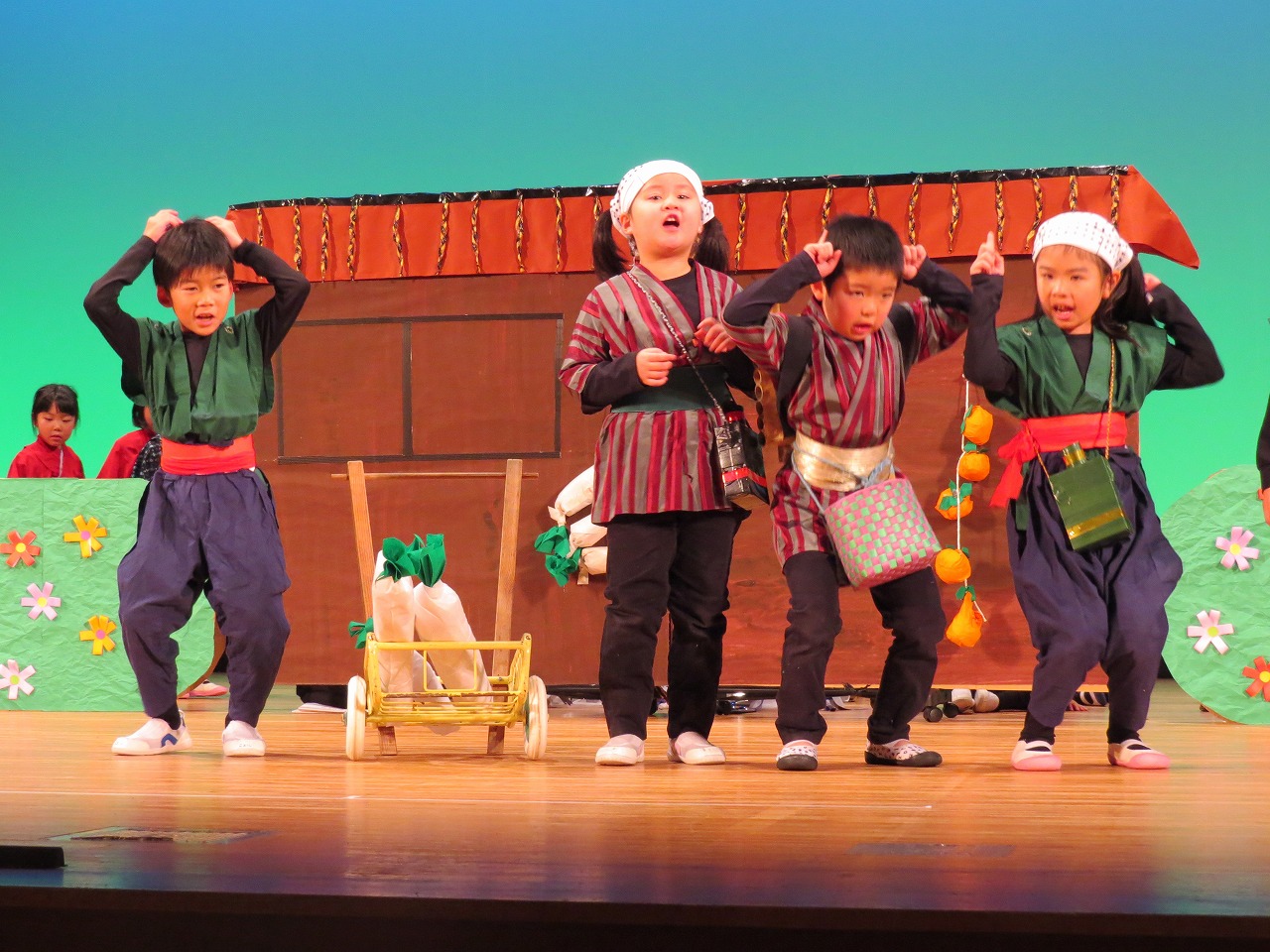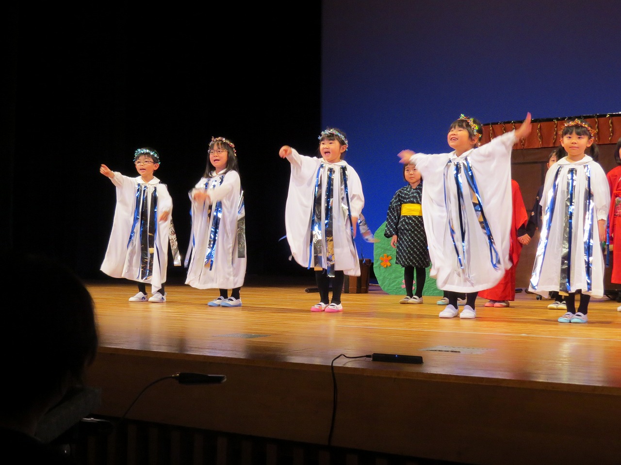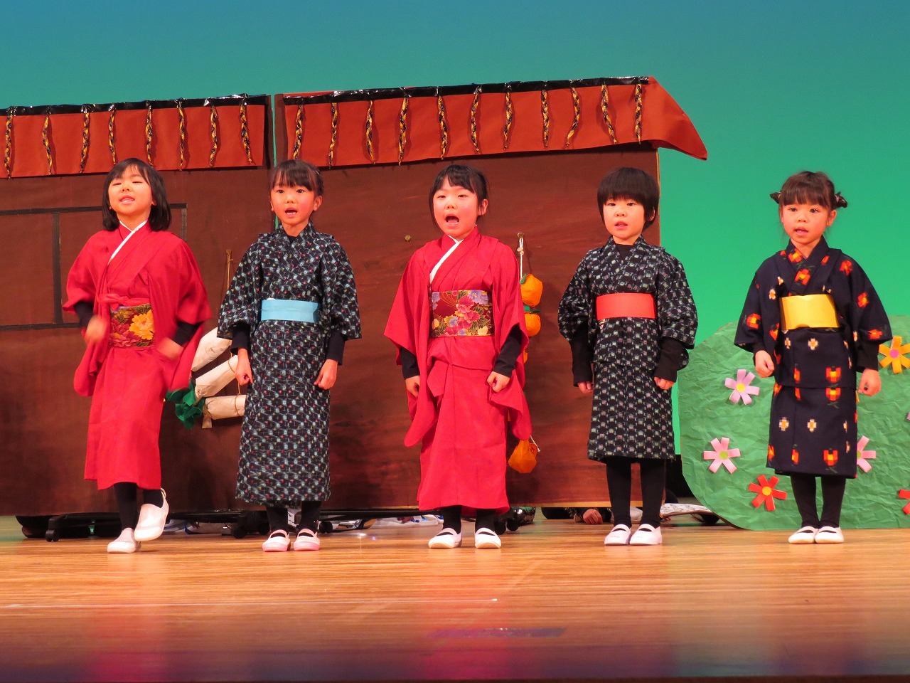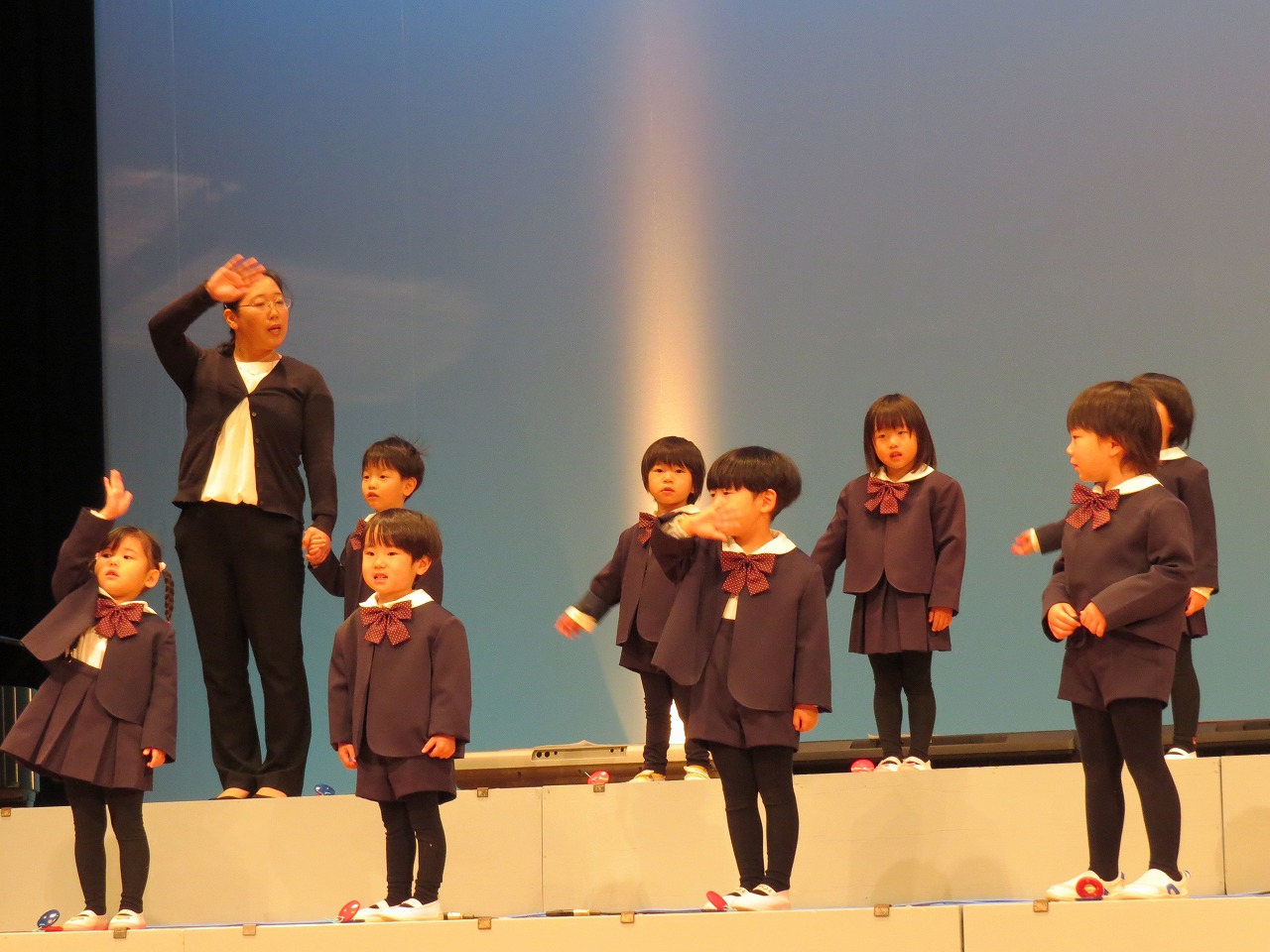 12月18日(木)は発表会を行いました。今年一年こどもたちが頑張ってきたことを保護者の方にも見て頂けるよう、それぞれのクラスが工夫しながら取り組んできました。さくら組さんは合奏や歌、オペレッタ「おむすびころりん」に挑戦!すみれ組さんは鼓隊演奏とミュージカル「シンデレラ」に挑戦しました。そして、ふじ組さんはアンサンブル奏「ディズニーメドレー」と劇「泣いたあかおに」を年長児らしく発表してくれました!本番の舞台裏では、「緊張するー」とドキドキする子どもたちの様子が見られましたが、いざ舞台の上に立つと、みんな一生懸命に笑顔で演じることができました!発表が終わると「楽しかったー!!」という声がたくさん聞こえ、達成感や喜びを感じ、大きな自信へと繋がったようです。「また発表会やりたい!」という子もいた程、一人ひとり輝くことができました。