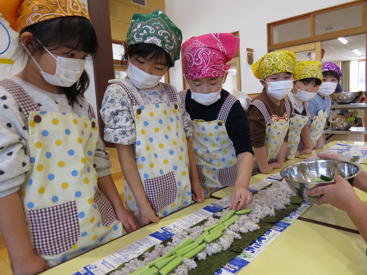 2月20日(金)はランチパーティーをしました!ふじ組はのり巻き、すみれ組は豚汁うどん、さくら組とぱんだ組はポテトサラダを作りみんなで食べることにしました。大きなのり巻きは息を合わせて巻くのことが難しかったようですが、みんなで協力して完成!うどんも一生懸命足でふみふみ、手でこねこねして伸ばし、こしのあるうどんになりました。ポテトサラダやデザートも愛情込めて美味しくでき、自分たちで作ったごはんに大満足の子どもたちでした。