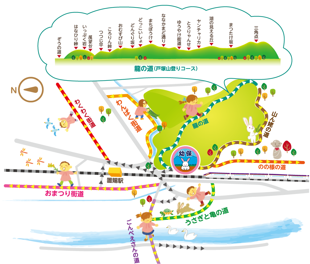 戸塚山こども園には、戸塚山の山登りをはじめ、たくさんの散歩コースがあります。